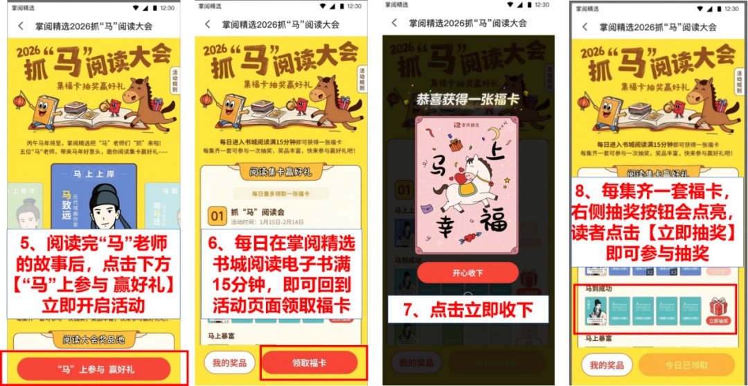读者每日阅读满15分钟即可解锁一张好意头福卡,每集齐一套福卡即可参与抽奖,最高可抽六次!