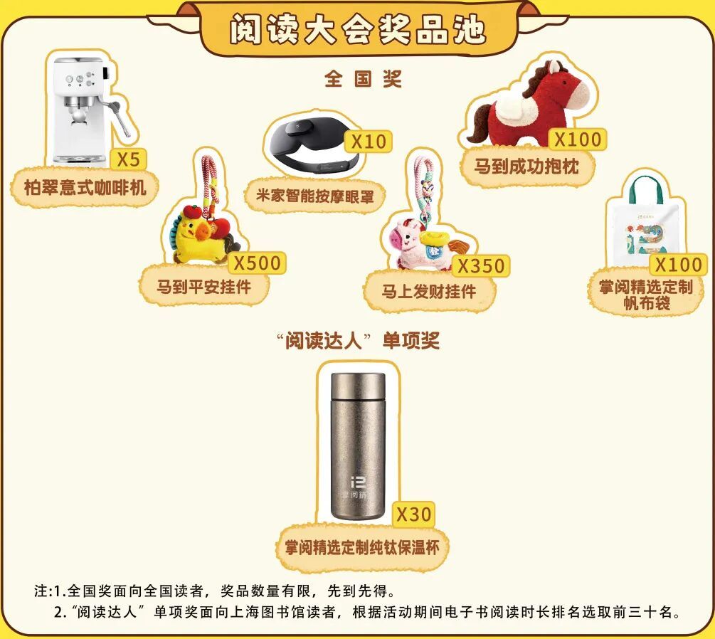 2.本次活动奖池共设置30份"阅读达人"单项奖奖品,面向上海图书馆读者,选择活动期间阅读时长排名前30名的读者进行发放。