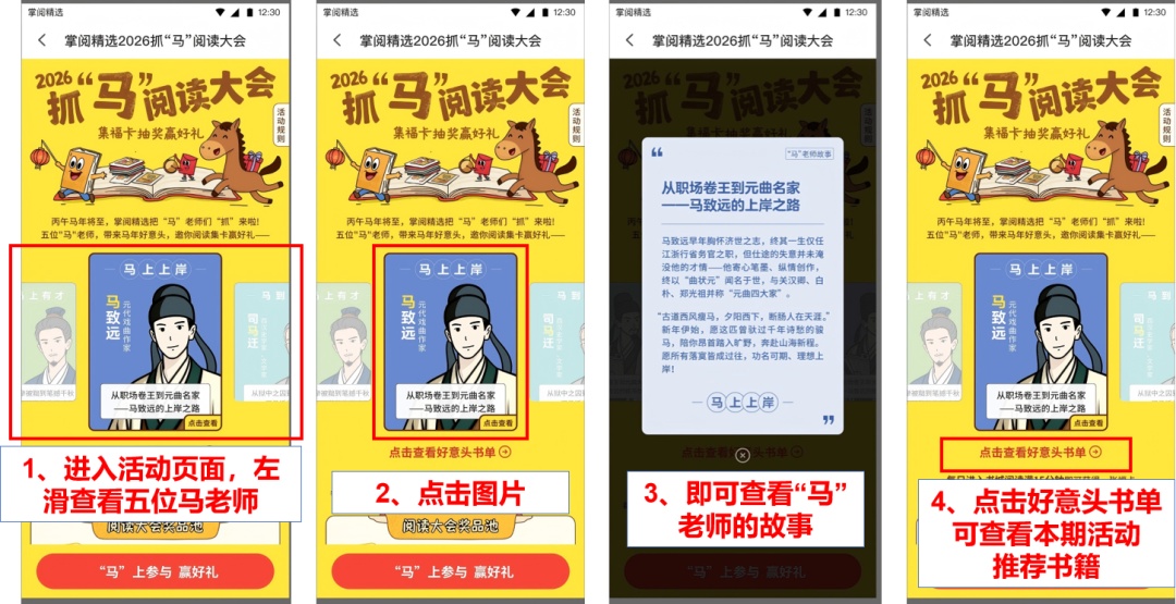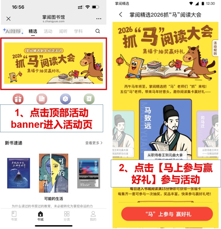 在书城主页顶部轮播图找到2026抓“马”阅读大会活动banner,点击进入活动页后再点击底部【“马”上参与赢好礼】按钮即可参与活动。