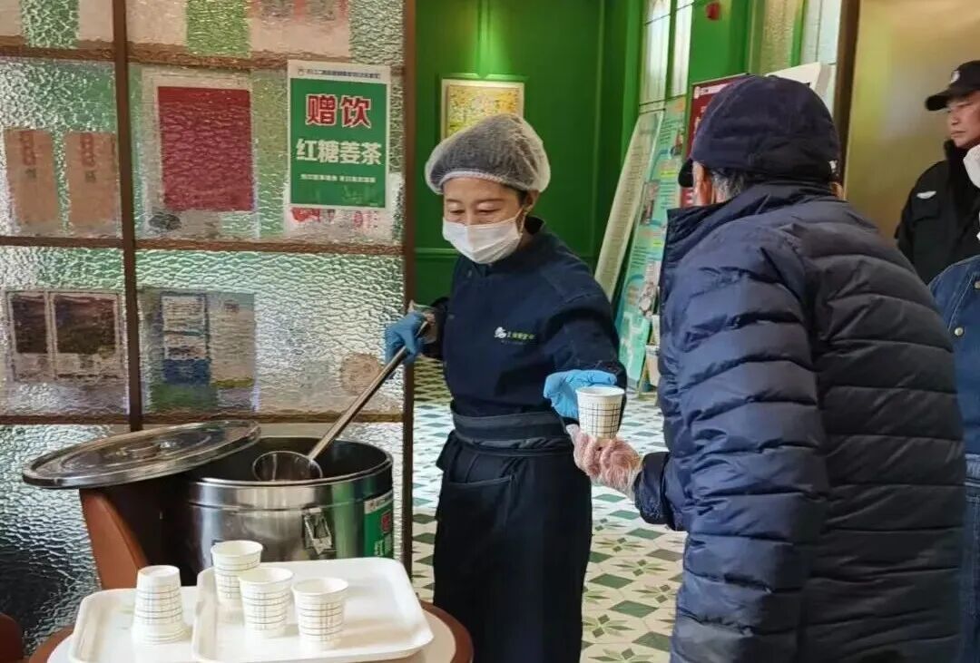 兜底保障,是寒潮中最动人的“担当”。冷空气来临,社区食堂特意熬制了驱寒暖身的姜茶,免费向前来就餐的社区居民和快递员、环卫工人等室外工作人员供应,一杯暖暖的姜茶,驱散一身寒意,温暖了社区居民的心。