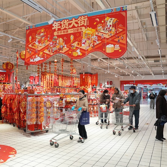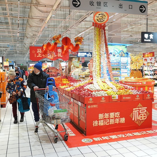 大润发线下门店积极响应上海打造文旅商体展融合消费场景政策,以红火喜庆的春节装饰营造沉浸式“年货大街”场景,并携手洽洽、稻香村等品牌推出多款联名定制礼盒,旗下“润发甄选”系列也上新十余款走新又走心的佳节礼盒。