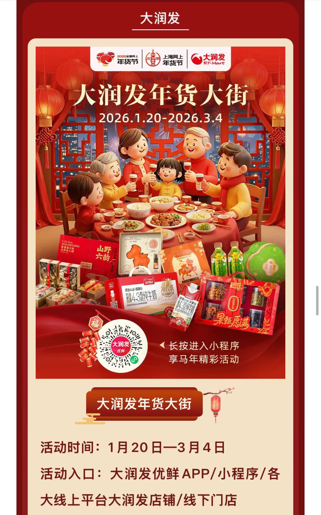 即日起至3月4日,2026全国网上年货节和上海网上年货节拉开帷幕,大润发积极参与,并推出优鲜App线上“年货大街”,以“一站式承包团圆年味”为核心,为市民打造便捷高效的年货采购通道。