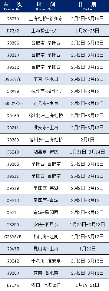 据上海铁路客户服务中心介绍,根据旅客出行需求,铁路部门增开了部分旅客列车。增开列车包括G8370(上海虹桥—徐州东)、D73/2(上海松江—汉口)等。赶快过来看看有没有您需要的车次吧!
