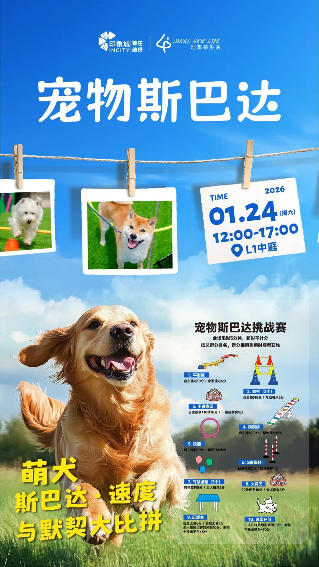 1月24日12:00—17:00,莘庄维璟印象城L1中庭将迎来一场别开生面的“宠物斯巴达挑战赛”,邀您与爱犬共赴一场速度与默契的激情较量。