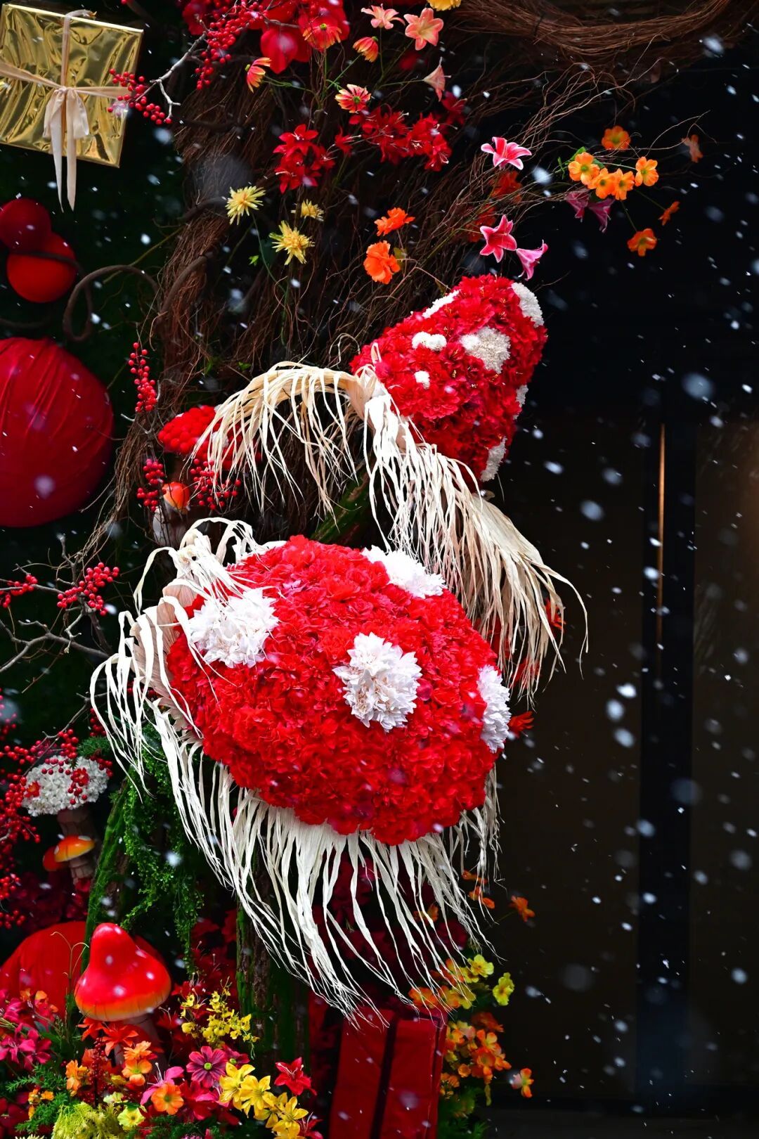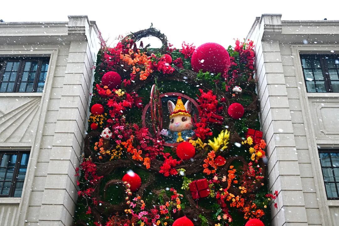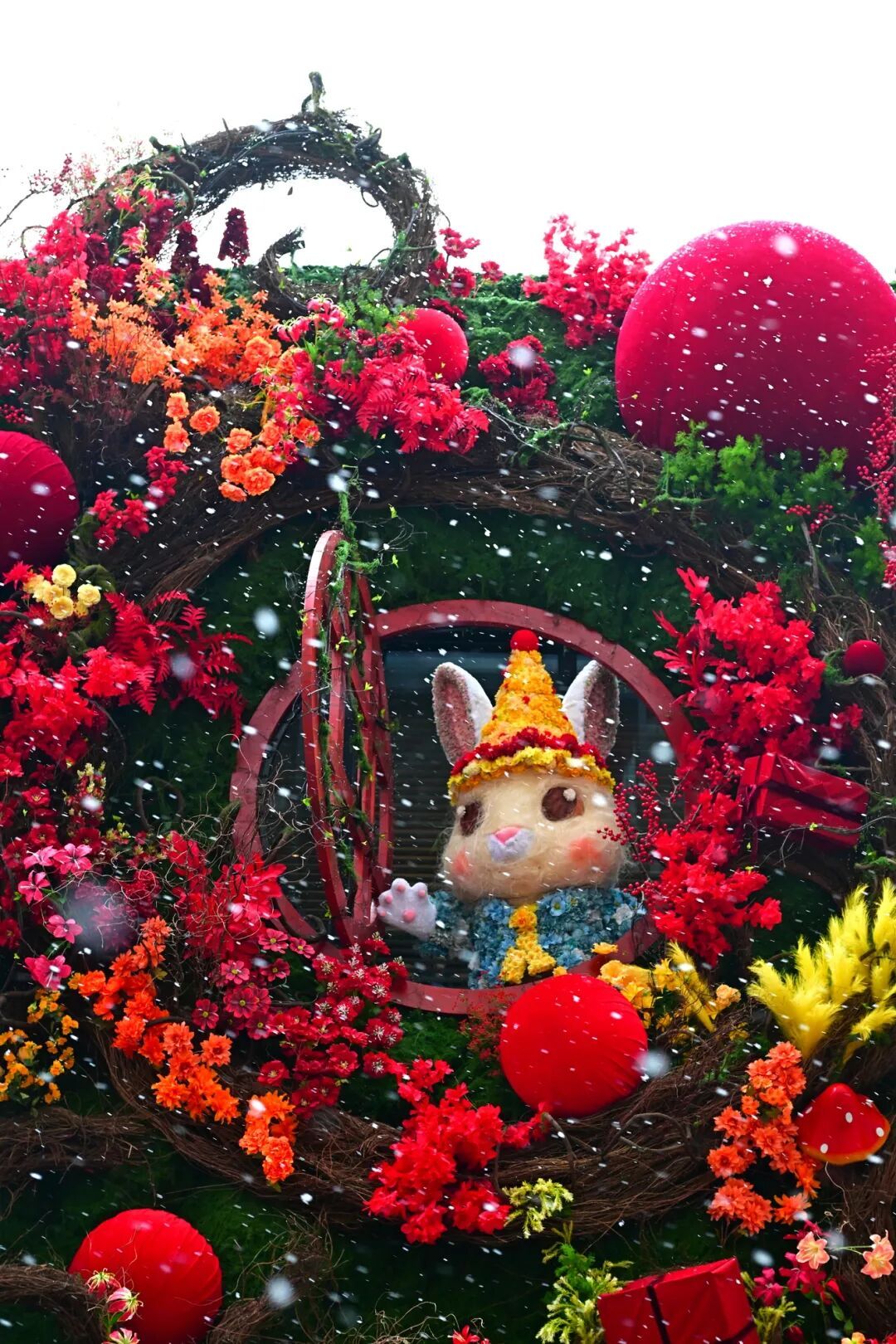 漫步街头,宛如闯入摩登童话:戴派对帽的萌兔探头邀你入境,红蘑菇与繁花藤蔓攀附建筑肆意生长,满是灵动生机。红韵裹着古韵,童趣交融雅致,每一处都能拍出氛围感大片。