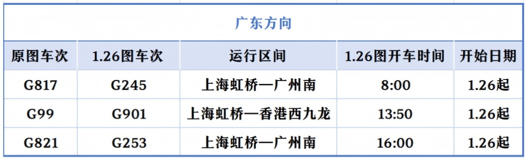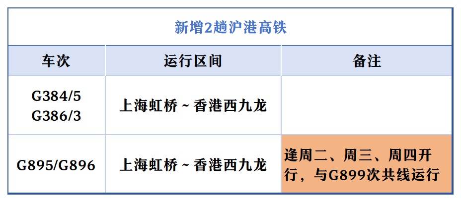 调图后,上海虹桥站新增开往香港西九龙站的G384次高铁列车(每日8时47分从上海虹桥站始发),以及夕发朝至的高铁动卧列车G895次(逢周二、周三、周四20时15分从上海虹桥站始发,次日7时25分抵达香港),全程运行时长分别为9小时5分钟和11小时10分钟。