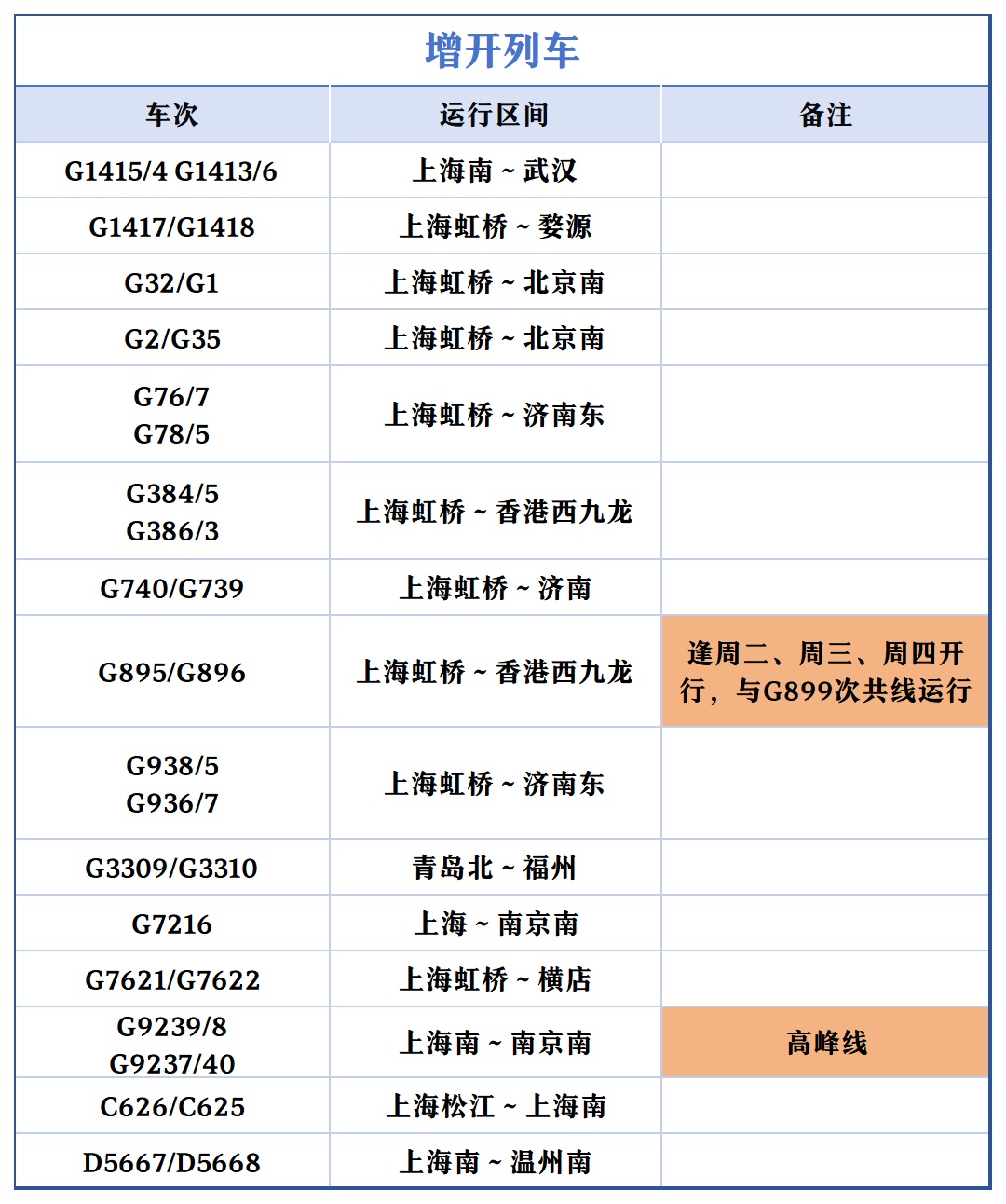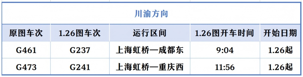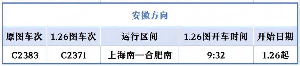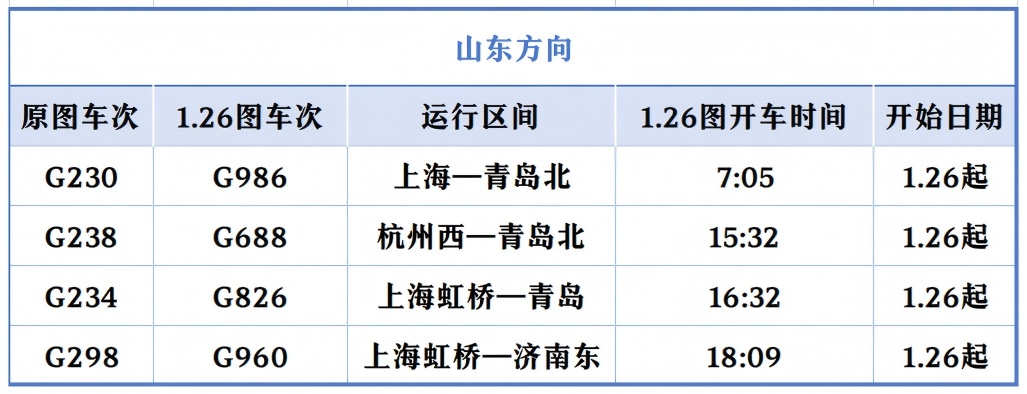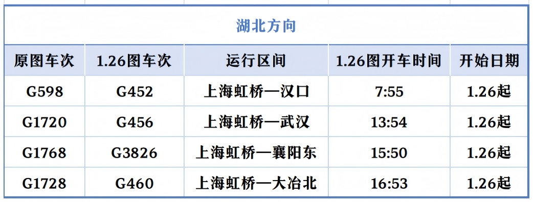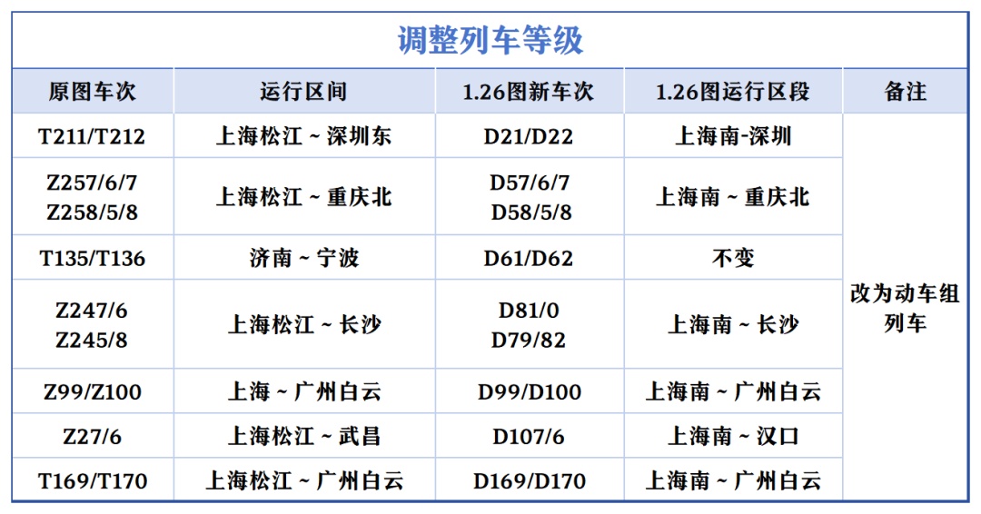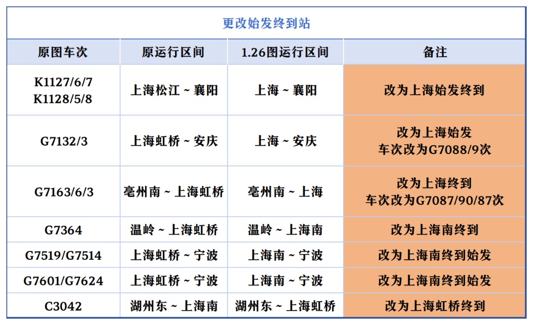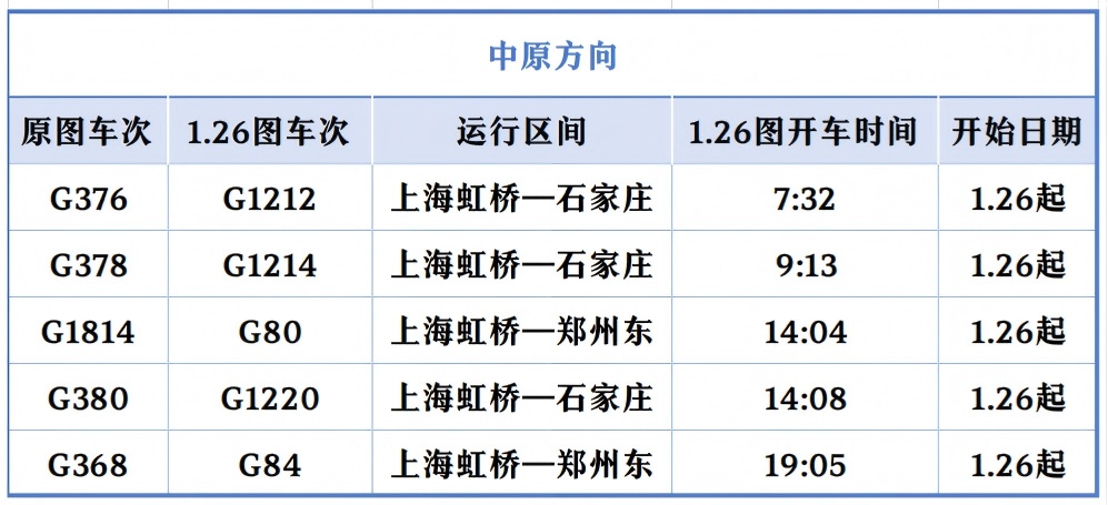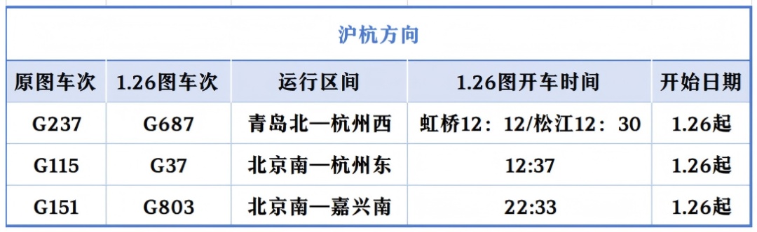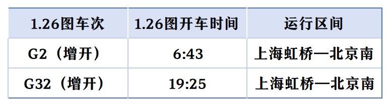 上海开往北京的“大站停”标杆高铁列车在开行时间上“前延后续”,首趟“大站停”列车由原先7时整从上海站出发,提前至6时43分上海虹桥站出发;末班“大站停”列车由原先18时52分上海虹桥站始发的G28次列车,变为G32次、19时25分虹桥站发车。