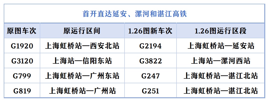 此次调图中,铁路上海站对部分列车运行区段进行优化调整,今后上海的旅客将可乘坐高铁列车直达河南漯河、粤西湛江,以及陕北革命老区延安。