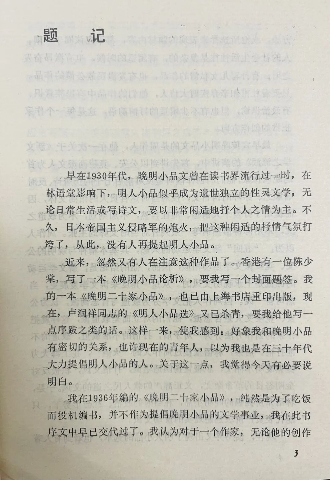 近来,忽然又有人在注意这种作品了。香港有一位陈少棠,写了一本《晚明小品论析》,要我写一个封面题签。我的一本《晚明二十家小品》,也已由上海书店重印出版,现在,卢润祥同志的《明人小品选》又已杀青,要我给他写一点序跋之类的话。这样一来,使我感到:好像我和晚明小品有密切的关系,也许现在的青年人,以为我也是在三十年代大力提倡明人小品的人。关于这一点,我觉得今天有必要说明白。