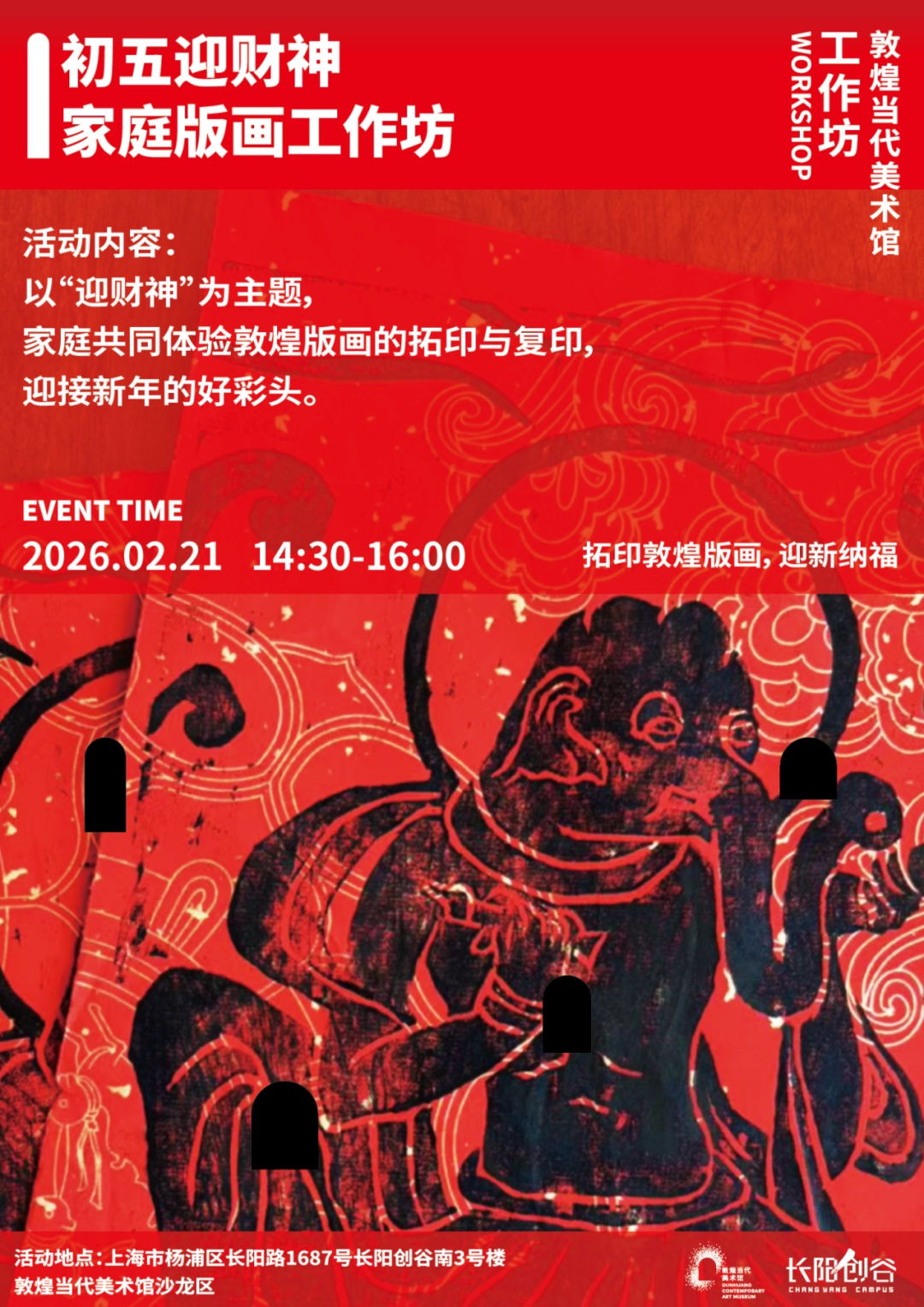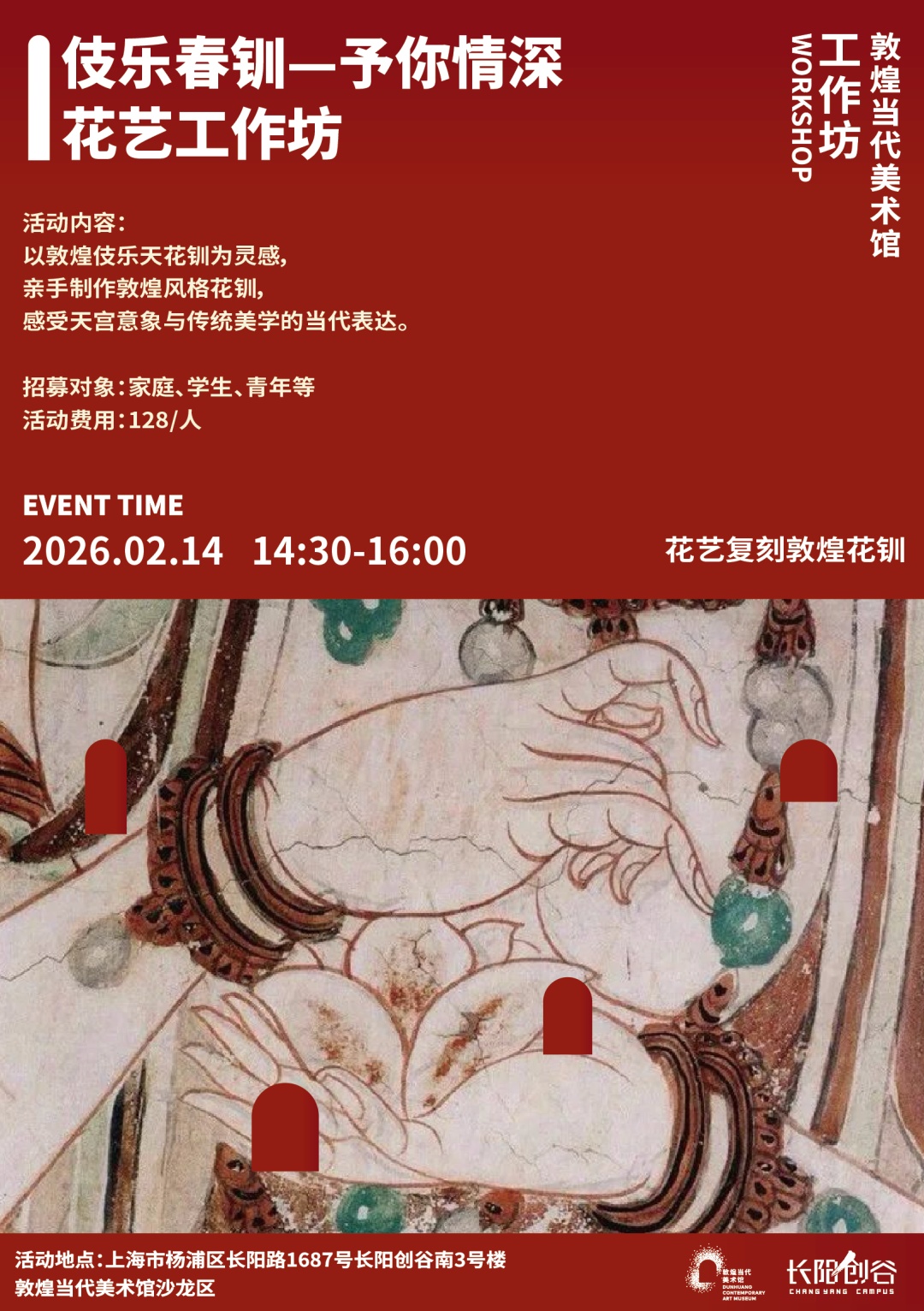 在“春联·送福”活动中,体验在敦煌马纹春联纸上挥毫泼墨的庄重仪式感;针对情人节推出的“伎乐春钏”花艺工作坊,以敦煌壁画中的花钏为灵感,将古典浪漫融入现代生活 ;而正月初五的“迎财神”版画工作坊,则让市民亲手拓印象征富足的敦煌版画,把“好彩头”带回家。