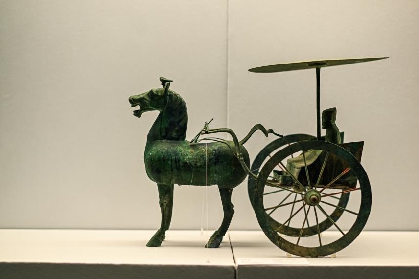 展览独具匠心地呈现了两件重量级国宝真迹:一件是甘肃省博物馆馆藏的东汉《铜轺车》,它与中国旅游标志“马踏飞燕”出土于同一墓葬,凝结了汉代工匠对速度与力量的极致想象。