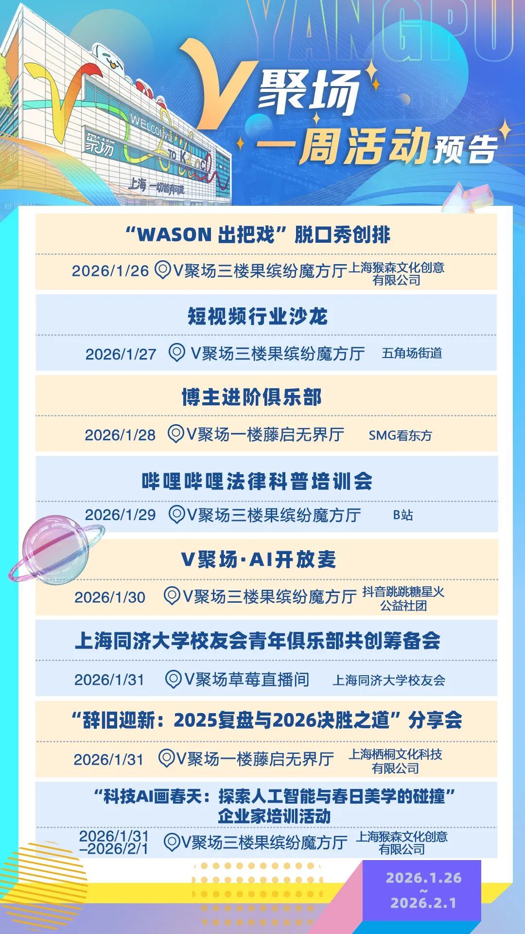 与千万粉丝“UP主”面对面互动,和B站、抖音、小红书等互联网大厂座谈交流,与AI领域创始人探讨人工智能发展新趋势……在杨浦V聚场,随时都有最前沿活动等你来打卡。无论你是互联网从业者,还是创意玩家……这里都将成为你迸发灵感的“能量场”。V聚场1月26日-2月1日一周活动预告来啦!快来碰撞灵感~