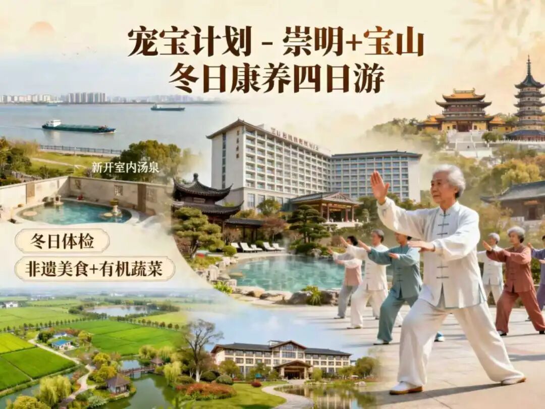 宝山滨江一带视野开阔、游玩设施齐全、活动内容丰富,崇明岛是全国知名的绿色岛屿,农产品丰富。线路结合宝山滨江休闲资源与崇明岛绿色生态,通过便捷水上交通串联,为银发族提供冬日养生、开阔舒心的康养四日行程。