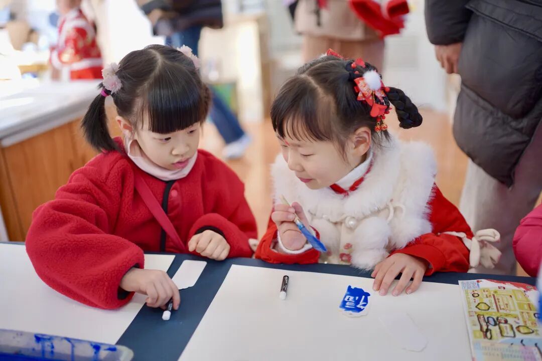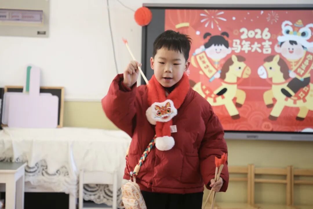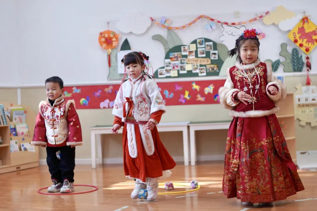 一走进幼儿园,仿佛走进“行走的岁时画卷”,到处都是红彤彤的装饰,充满了年味。孩子们个个穿戴得像从年画里走出来的福娃娃,家长们举着手机频频拍照,笑声、招呼声交织在一起,让这座“童年院子”变得热气腾腾。