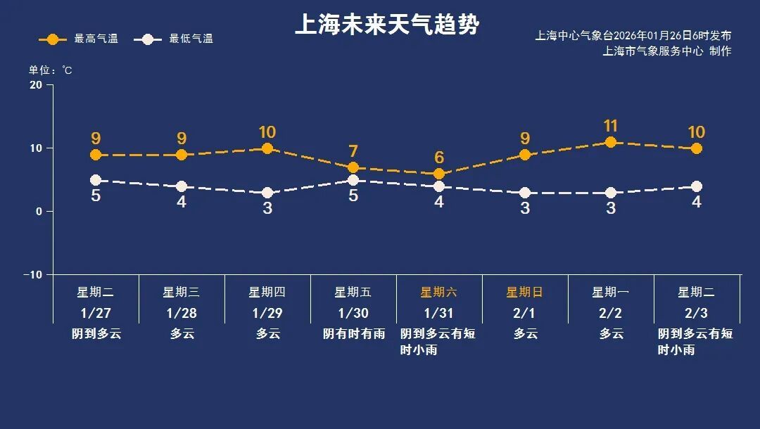 1月27日(周二):阴到多云转阴到多云有短时小雨,5~9℃