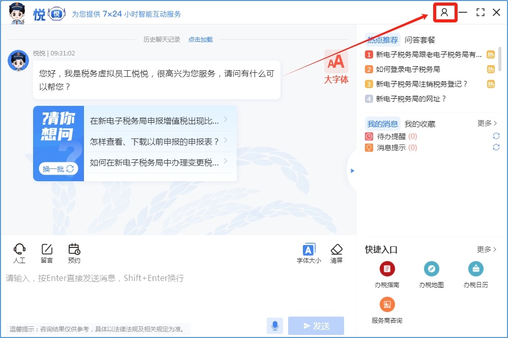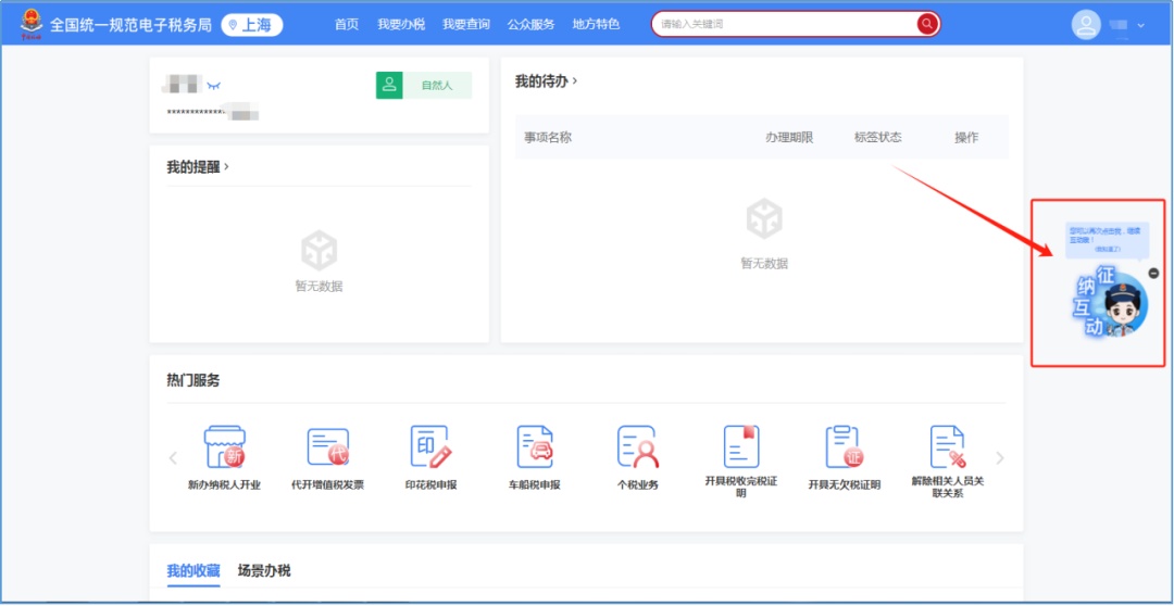 登录全国统一规范电子税务局(上海)后,您可点击界面右侧征纳互动【悦悦】头像,进入征纳互动统一入口。