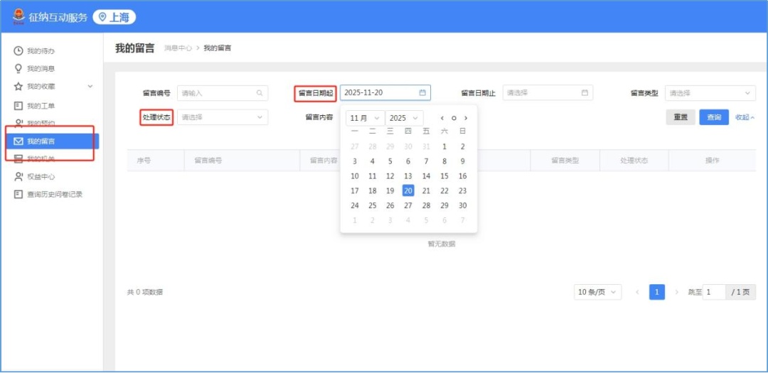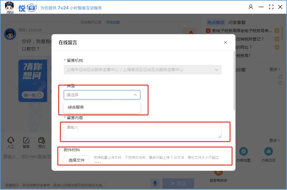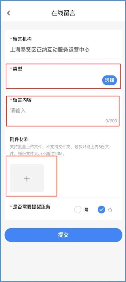 进入留言界面后,填写相关表单(带*为必填项)。若有税务人员通知您补正资料,您可在留言内容中注明需要传递的坐席人员,方便后续留言分派。