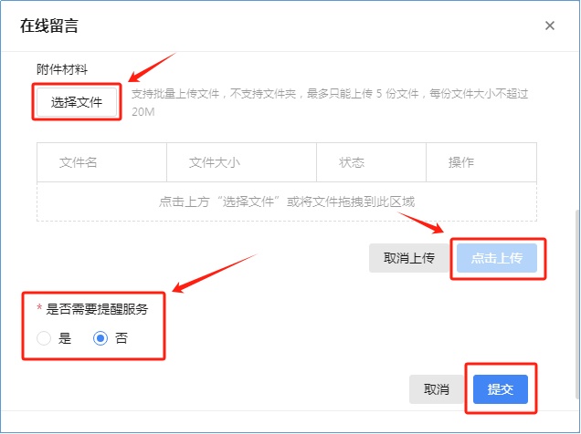 若需提交附件材料,选择文件后,需点击【点击上传】,您可根据需求选择是否需要提醒服务,填写完成后点击【提交】即可。