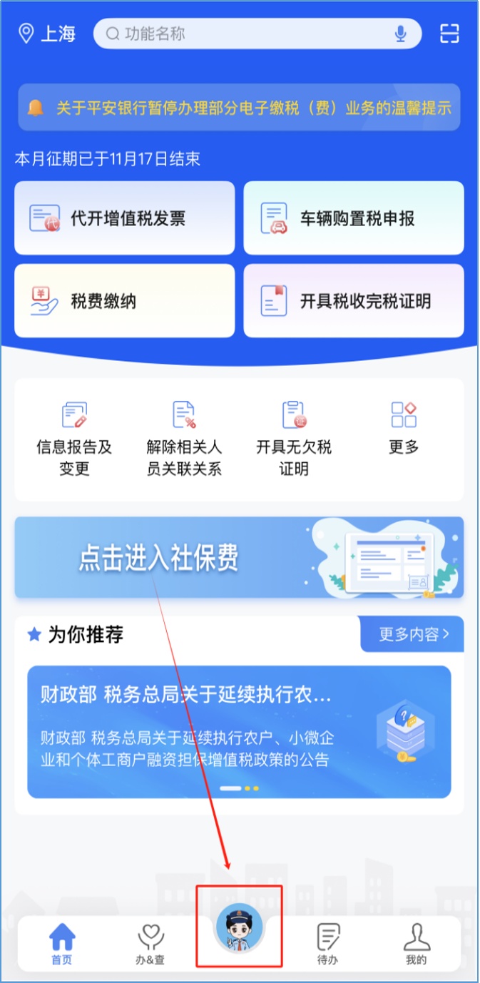 首次进入时需选择服务机关,您需要点击进入右上角【个人中心】-选择左侧栏【我的机关】-点击【修改】-选择【国家税务总局上海市xx区税务局】。