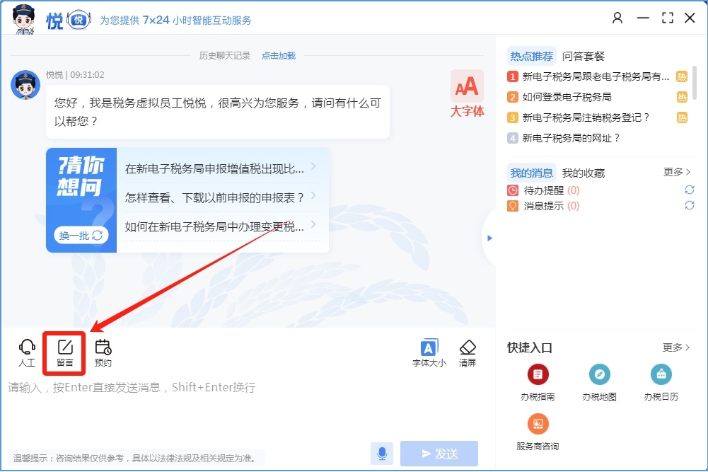 留言咨询:7*24小时,电子税务局网页、App均可进行留言。