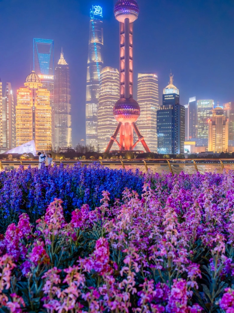 傍晚六点,灯光亮起,蓝色时刻降临。花海与天际线同框、低角度透过花隙拍摄江轮、与“金属蛋”及滨江艺术装置合影……每一个角落都透着静谧的诗意。