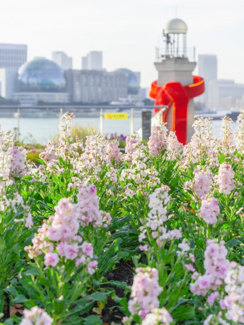 在海事塔前的花海,低机位可以把花海和陆家嘴同框,点缀行人氛围感超绝。