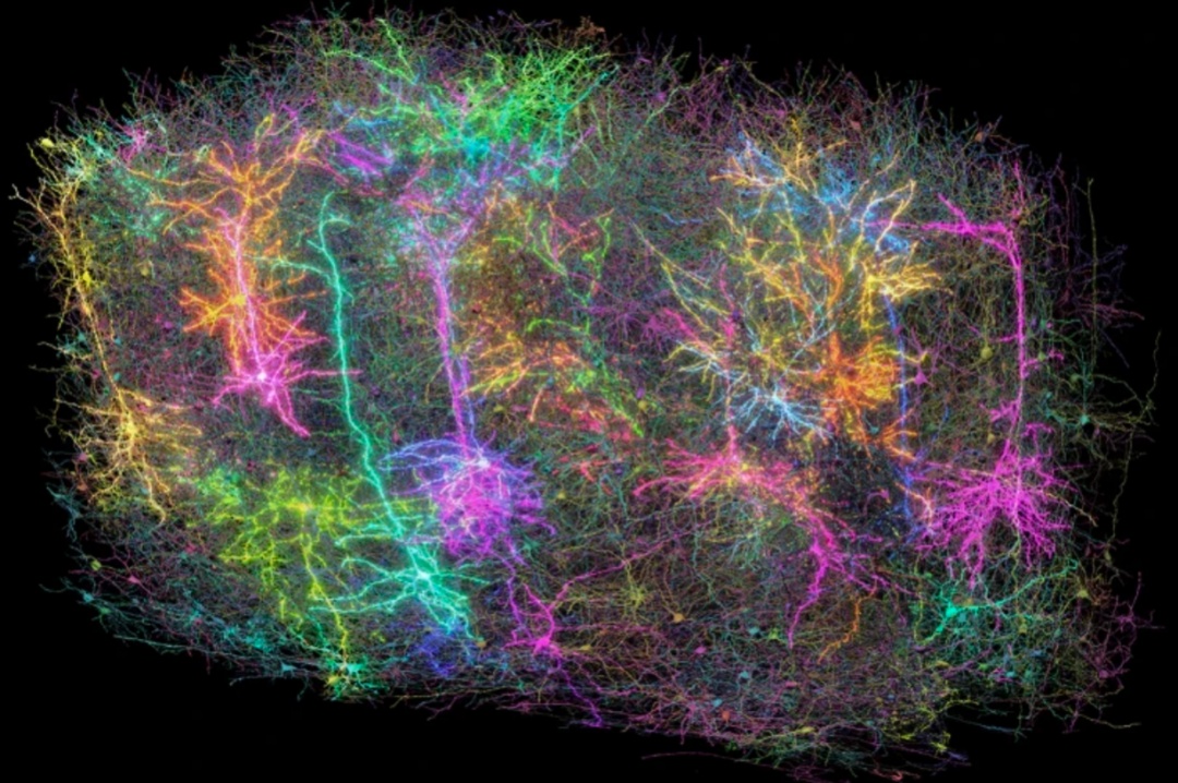 通过分析1立方毫米的小鼠脑组织重建的1000多个脑细胞的渲染图。图片来源:艾伦脑科学研究所