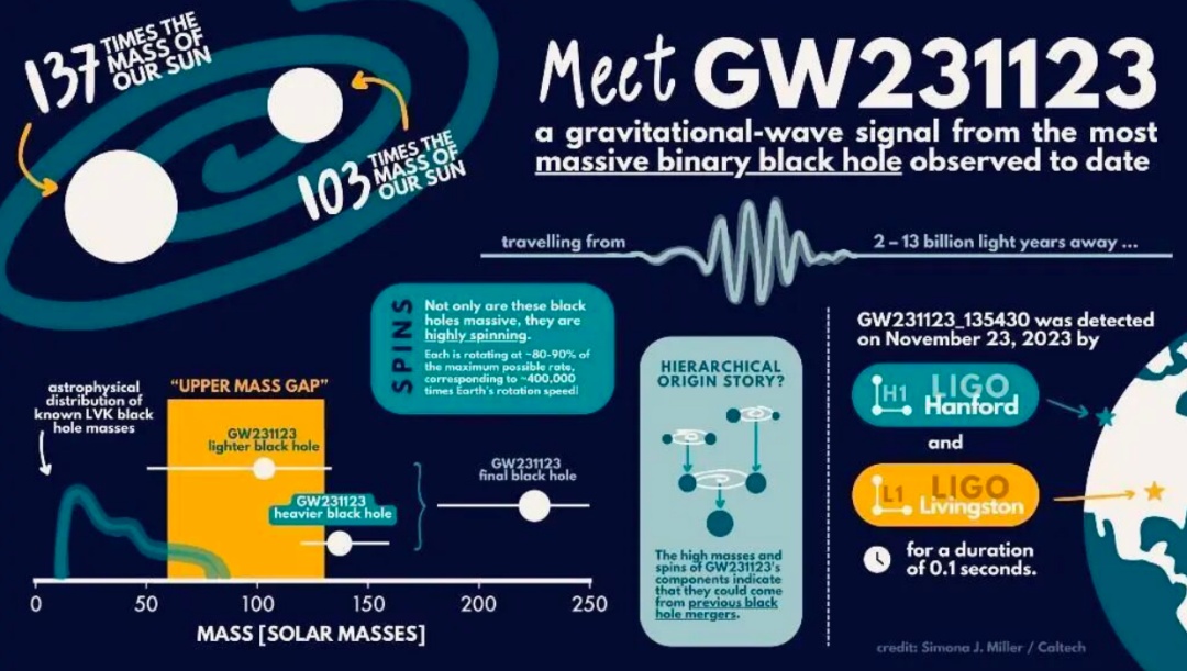 国际合作团队借助美国(LIGO)等探测器,探测到迄今最大质量黑洞合并事件,该成果对理解黑洞成长意义重大。这项由LIGO-Virgo-KAGRA合作组宣布的发现,源于2023年11月捕捉到的GW231123事件。