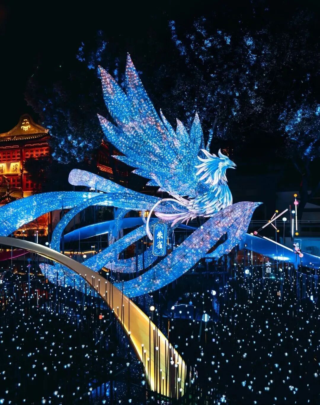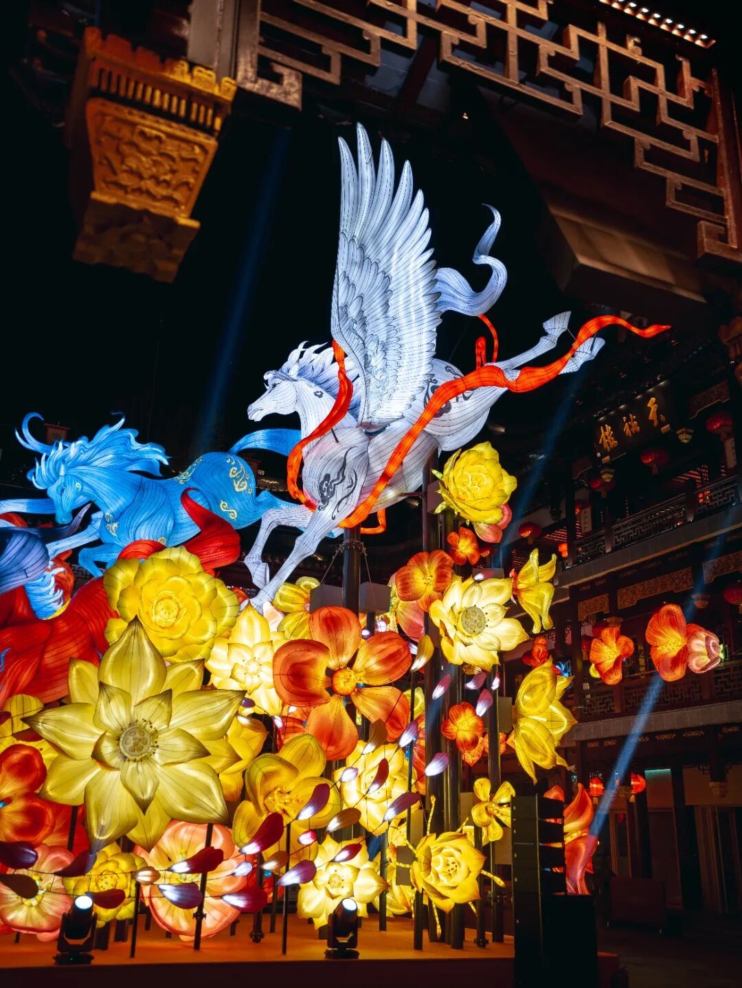 黄金广场的三层巨型走马灯以传统榫卯工艺为骨、数字光影为魂,六面年俗画卷循环流转;中心广场“骏驰九州,步步生花”主灯组取材“盛唐六骏”,融入洛阳博物馆馆藏元素,灯光亮起时马蹄生花,尽显马年祥瑞;九曲桥区域化身“马跃星河”幻境,二十八星宿与《山海经》神兽灯组交相辉映,帝江、吉量、飞廉等瑞兽在星海间驰骋,构筑起宏大奇幻的光影长卷。