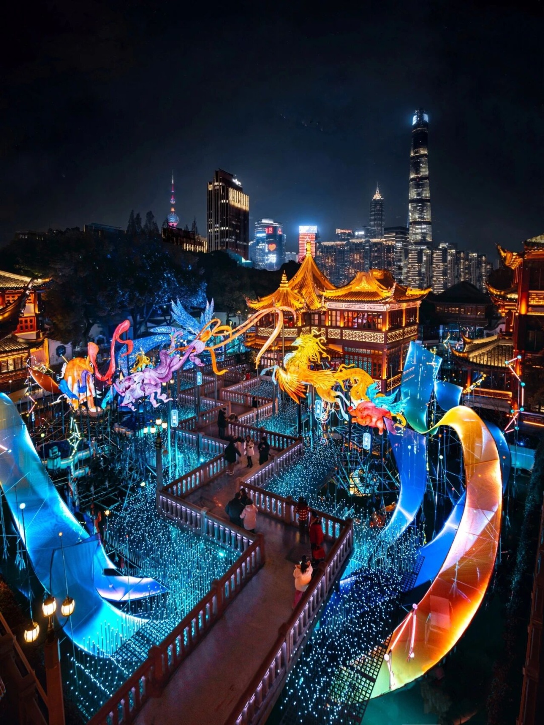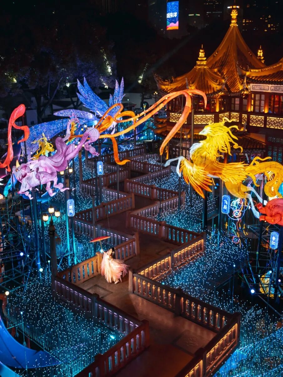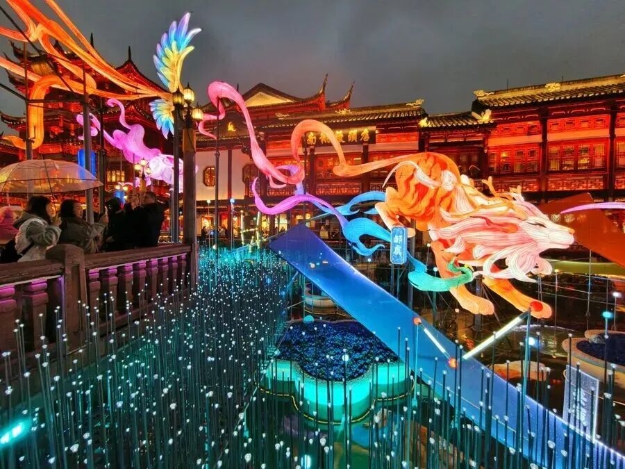 本届灯会打破传统灯会的空间局限,将灯影从豫园核心区延伸至外滩沿岸,形成覆盖多场景的全域赏灯格局。豫园民俗艺术灯区作为核心板块,推出《山海奇豫记》第四季《旷野篇》,以“以梦为马,旷野生花”为主题,通过非遗技艺与数智光影的深度融合,呈现传统文化与现代科技的时空对话。