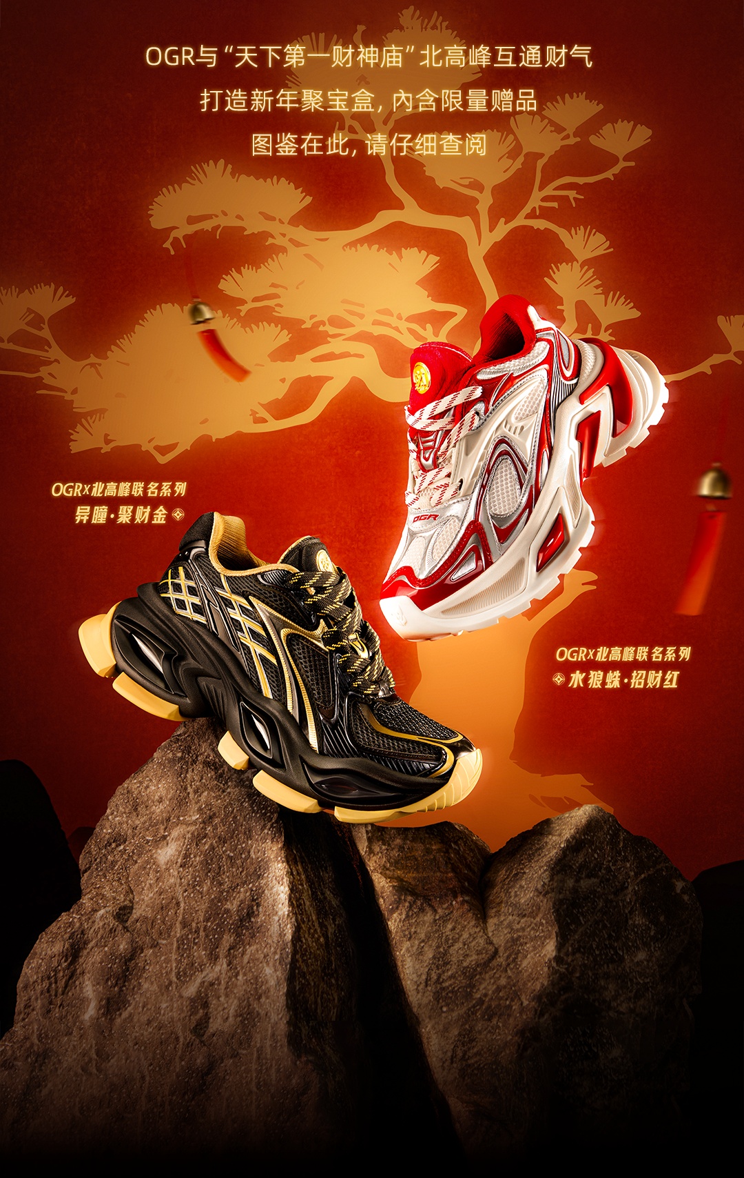 与BIRKENSTOCK勃肯不同,本土机能潮流品牌OGR则通过跨界联名,探索国潮表达的创新路径。其与文创品牌北高峰合作推出的2026马年限定“招财红”水狼蛛2.0老爹鞋,从新年登高习俗出发、赋予产品“步履积累、视野开拓”的美好寓意。