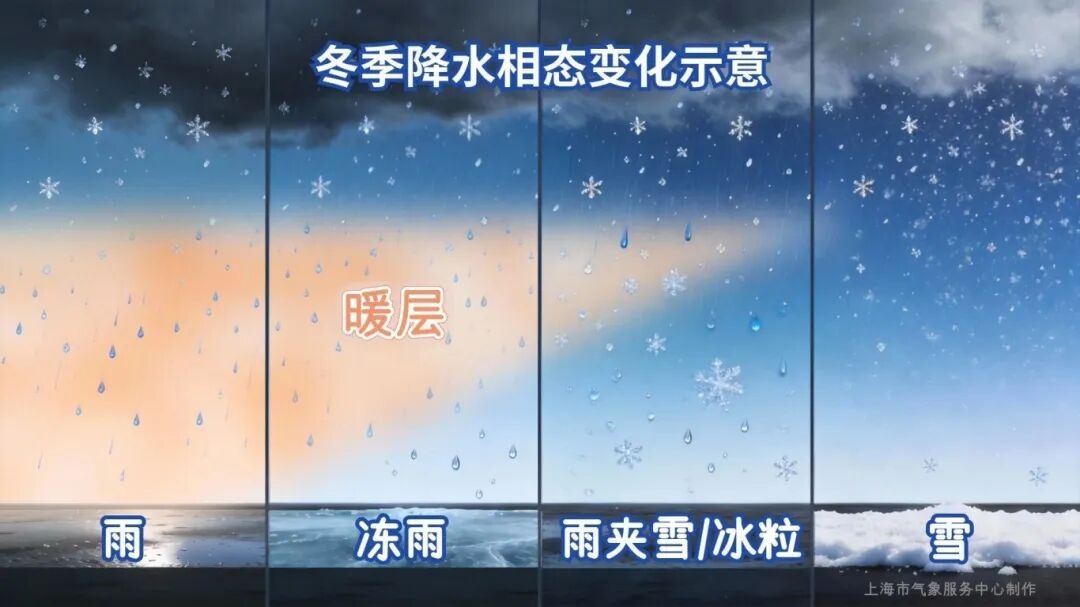 雪花从高空降落,最终以什么形态达到地面,取决于高空到地面的气温垂直分布。雪花降落过程中经过较厚的暖层完全融化,落到地面以降雨为主;降落过程暖层较薄,就会形成雨夹雪或冰粒;如果整层都偏冷的话就会以雪的形态落到地面。