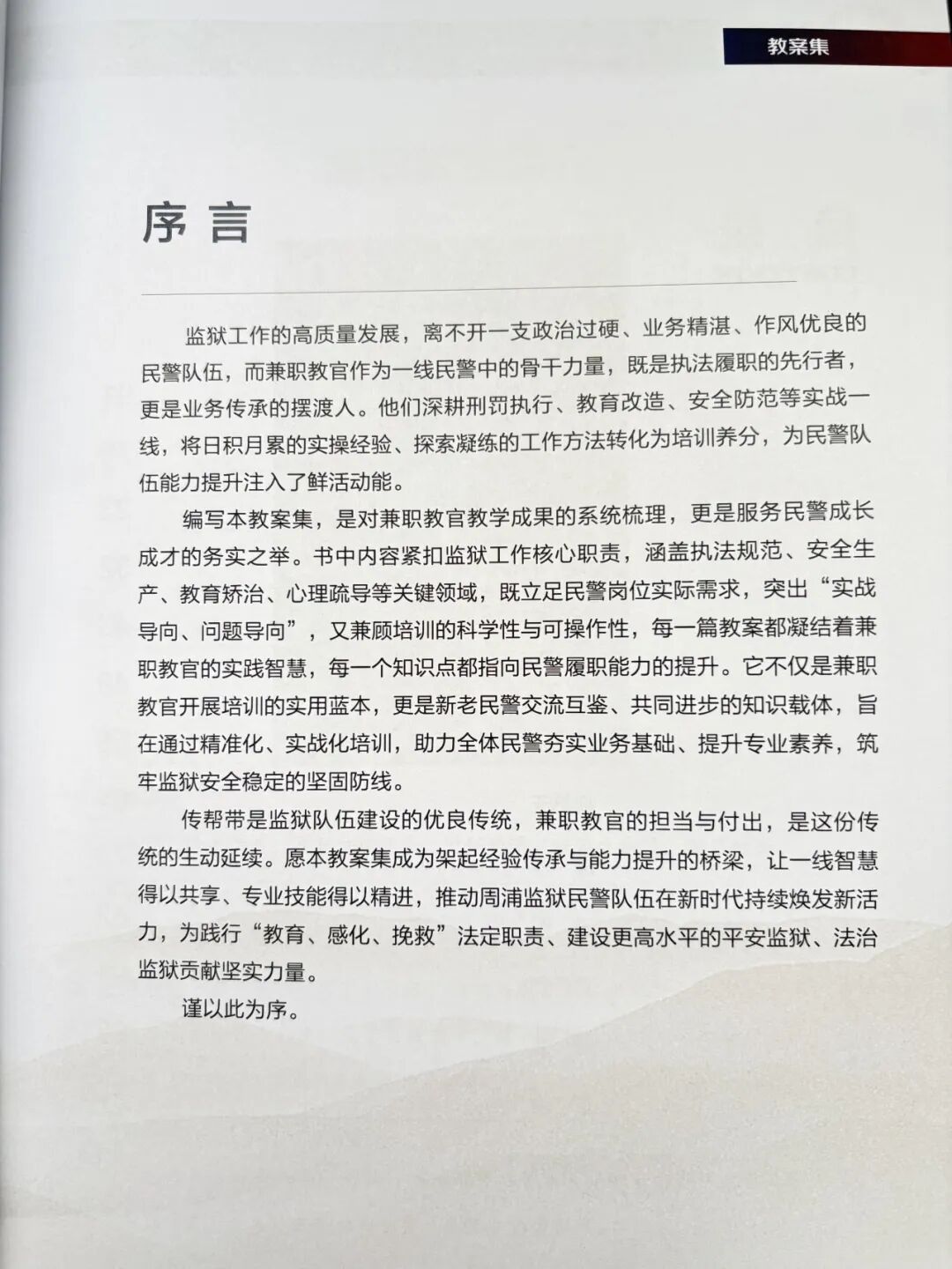 教官团对教学成果与一线经验进行系统梳理、精心打磨,汇编成“实用教案集”。这本教案集,既是日常开展培训的“教学蓝本”,更是监狱工作经验传递、精神传承的重要载体,把教官们的教学心得、实战技巧凝萃其中,让监狱的专业智慧不断迭代,持续推动队伍整体素质提升。