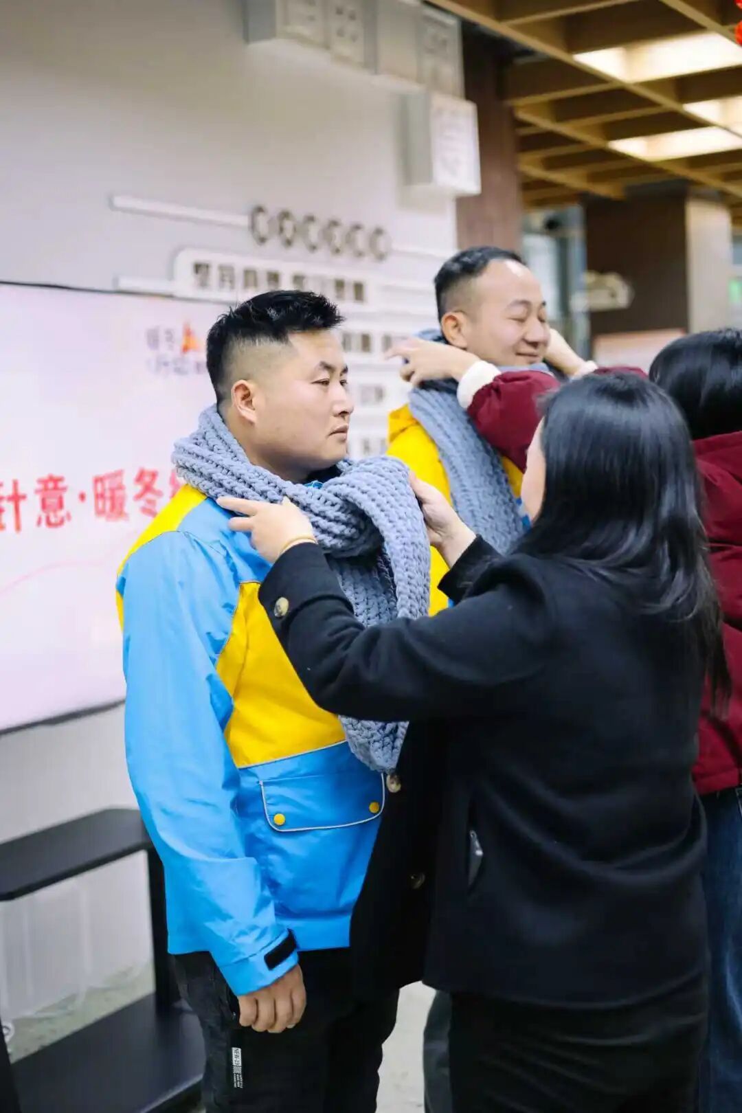 “针心针意·暖冬行动”环节,手工围巾承载着沉甸甸的心意。过去几周,虹梅街道楼宇白领志愿者利用业余时间,一针一线编织温暖。志愿者代表将围巾赠予优秀新就业群体代表,街道为志愿者颁发证书,致敬这份默默付出的善意。