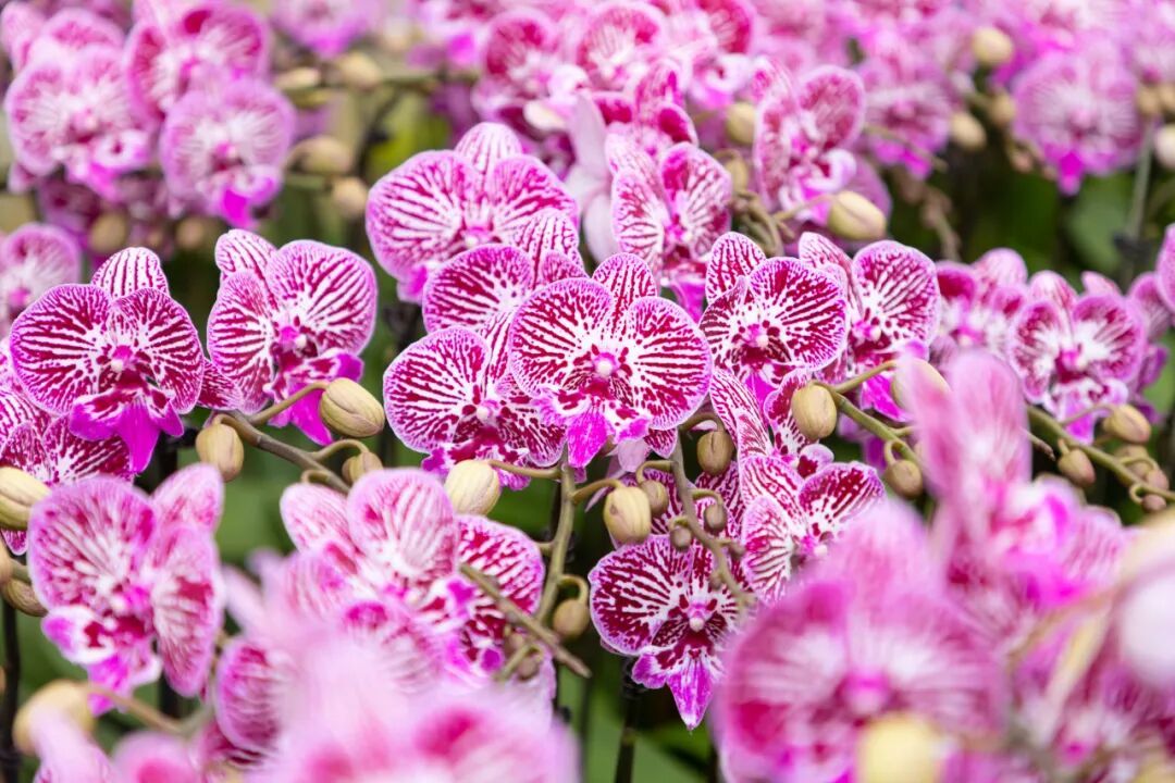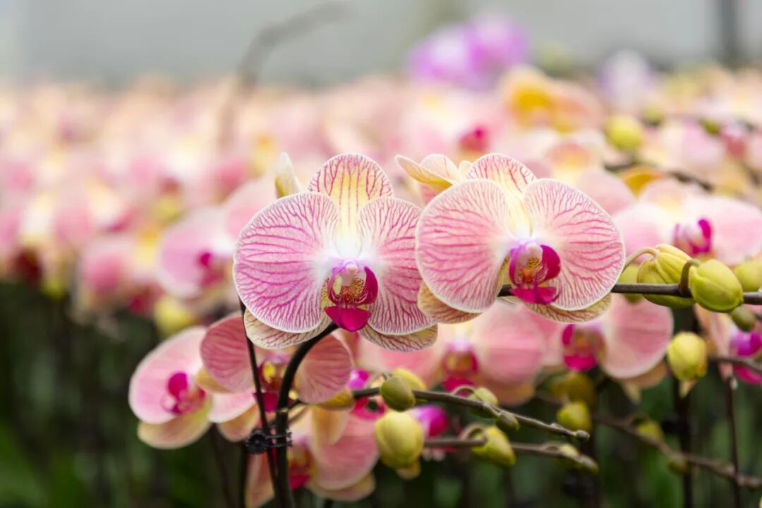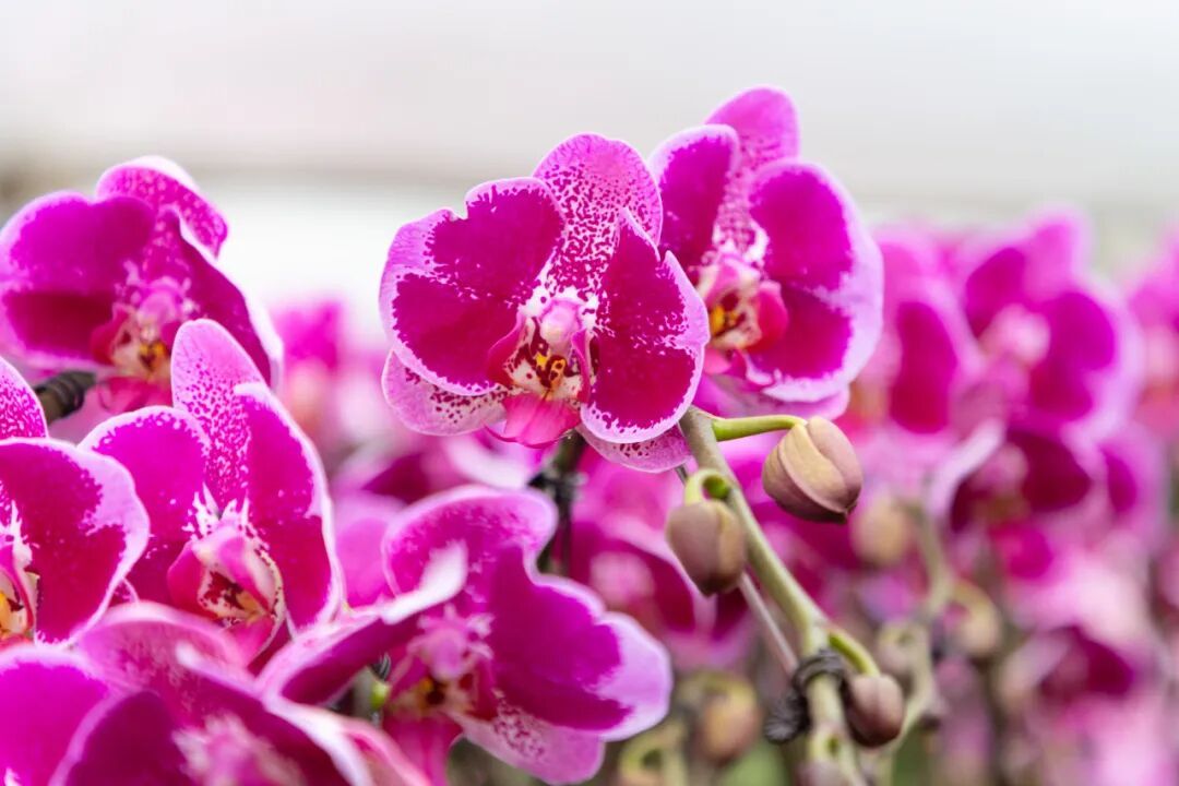 “目前我们基地培育了30多个蝴蝶兰品种,包括市场热销的‘藏宝图’‘网红’‘五星上将’等经典品种,也有‘樱花公主’‘绿精灵’等特色品种。”基地负责人介绍道。这些蝴蝶兰花色丰富,从纯白、淡粉到深紫、明黄,甚至还有带斑点、条纹的复色品种,满足不同消费者的审美需求。