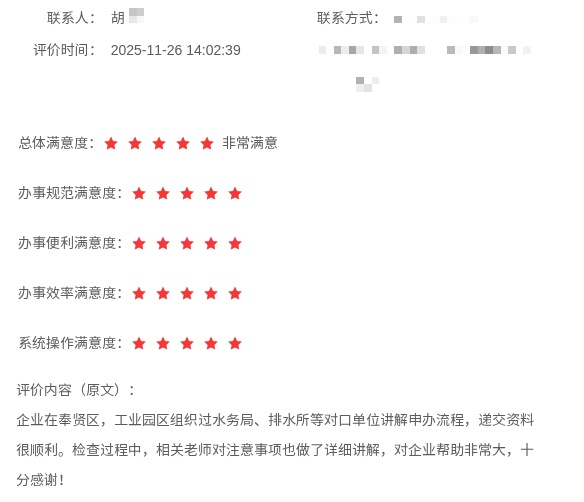 企业办理城镇污水排入排水管网许可留言“企业在奉贤区,工业园区组织过水务局、排水所等对口单位讲解申办流程,递交资料很顺利。检查过程中,相关老师对注意事项也做了详细讲解,对企业帮助非常大,十分感谢!”