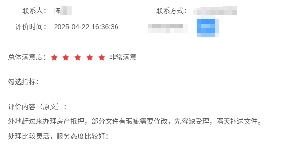 材料没带全?先办后补!市民提到“外地赶过来办理房产抵押,部分文件有瑕疵需要修改,先容缺受理,隔天补送文件。处理比较灵活,服务态度比较好!”。