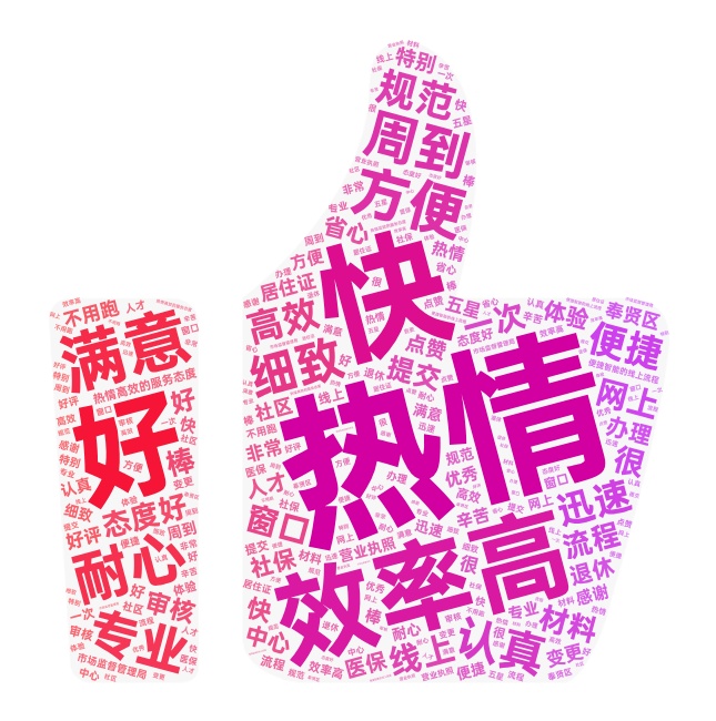 出现频率最高!市民在奉城镇社区事务受理中心办理社保卡时表示“拍照加办理几分钟就办好了”。市民在办理医师执业注册时表示“办事效率很快,工作人员态度也很好,第一次感受上海速度”。企业在人才发展服务中心办理《上海市居住证》常住户口审批留言“整个流程很快,一网通办查看进度很便捷,现场也只跑了一趟,效率很高,给我们的工作人员点个赞。”
