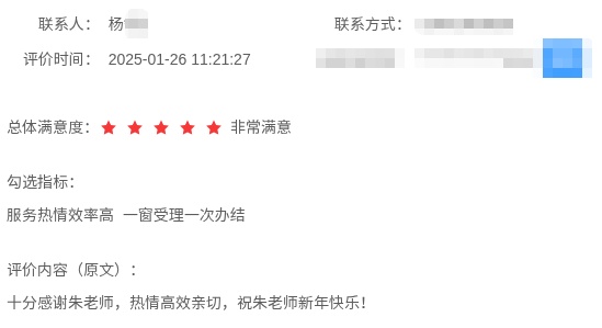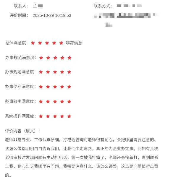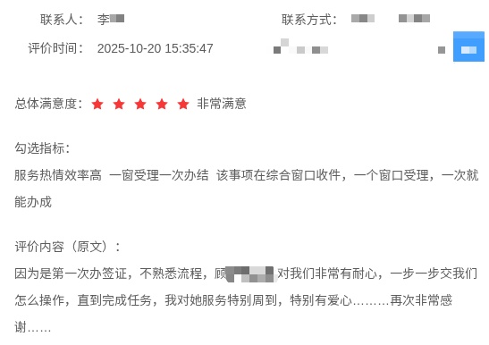 一位企业管理者申请境内申请外国人来华工作许可后写道:“老师非常专业、工作认真仔细,打电话咨询时老师很有耐心,会把哪里需要注意的、该怎么做都明明白白告诉我们,让我们少走弯路,真正地为企业办实事。比如有几次老师审核时发现问题主动打电话,第一次被我挂掉了,老师还会接着打,直到联系上我,耐心告诉我哪里有问题,我需要注意什么、该怎么调整,这点是非常值得点赞的。”