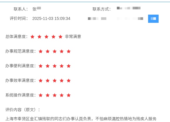 针对老年人、残障人士,各窗口在“不便”中提供方便,西渡街道一位老人办理个人申领养老金手续时表示“办事员工作态度和蔼可亲,轻声细语,不厌其烦,我填单子的时候填错了三张,她们又重新打印。办事手续不复杂,一步到位。”又如市民留言“上海市奉贤区金汇镇残联的同志们办事认真负责,不怕麻烦满腔热情地为残疾人服务!”