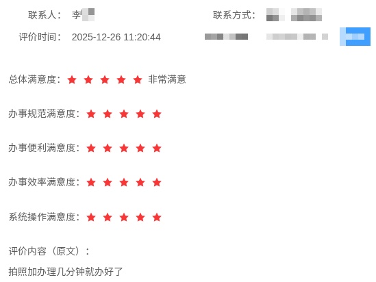 2025年,全区政务服务“好差评”系统累计收到近60万条评价,其中五星好评占比超过99.7%。“效率高”“态度好”“超方便”成为高频词,2061位市民更是不吝笔墨,主动写下好评留言。不少留言内容丰富、情感真挚,仿佛一篇篇用心撰写的“小作文”,细数办事过程中的温暖细节。更有市民风趣地感叹:“速度快到我怀疑是不是开了加速器?”
