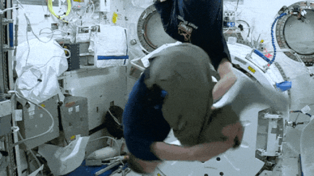 一位宇航员在空间站演示角动量守恒。由于旋转对称性,宇航员旋转速度加快是因为另一名宇航员给他施加了一个扭矩。