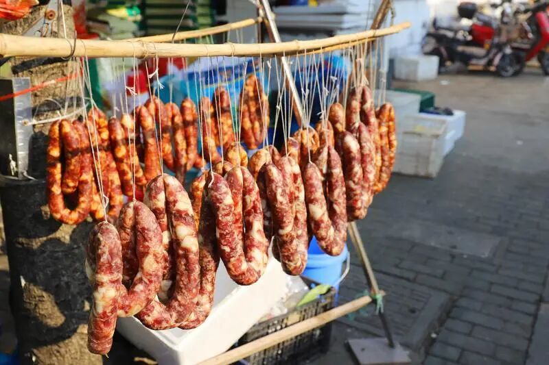 腊肠则是过年餐桌上的“硬通货”,精选肥瘦比例适中的新鲜猪肉,先人工切块再机器绞碎,既保留肉质颗粒感又让味道均匀分布。灌入肠衣后可按需加辣椒调味,挂晒半个月锁住浓郁腊香。咸肉的制作还多了几分互动感,顾客可亲自挑选五花肉,再由陈传红切条、手搓撒盐。经过一周挂晒后的咸肉,肥而不腻、咸香醇厚。