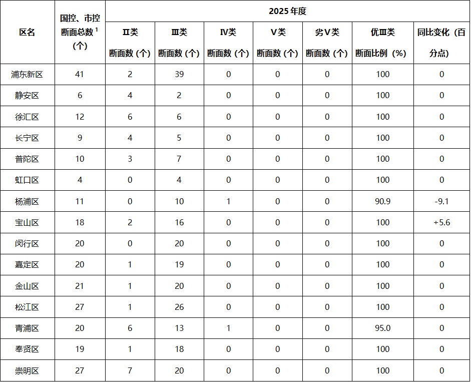 2025年度,按照各断面1月至12月监测数据均值评价,杨浦区、青浦区各有1个断面为Ⅳ类,其余各区所有地表水断面均达到优Ⅲ类。与2024年度相比,浦东新区、静安区、徐汇区、长宁区、普陀区、虹口区、闵行区、嘉定区、金山区、松江区、奉贤区、崇明区优Ⅲ类断面比例保持在100%,宝山区优Ⅲ类断面比例有所上升,杨浦区优Ⅲ类断面比例有所下降,青浦区优Ⅲ类断面比例持平。