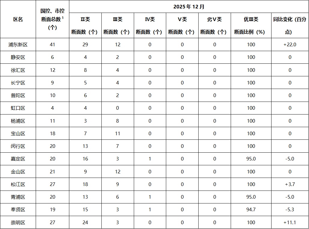 注:全市国控、市控断面中,涉及各区考核的断面共264个(奉贤区、浦东新区共考断面1个,黄浦区无地表水国控、市控断面)。2025年12月,普陀区2个市控断面受河道施工影响停测,不参与优Ⅲ类断面比例统计。