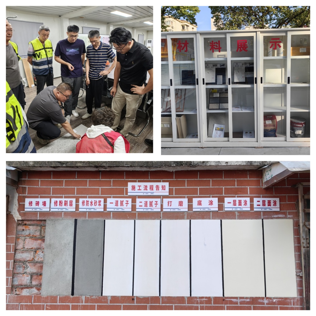 我们严把材料关,坚持“一线品牌、居民放心”,优选立邦、中财、东方雨虹等行业翘楚产品,并执行出厂检测、到场验收、第三方送检三重质量保障;我们严守工艺关,要求各区统一施工细节,构建“施工单位自查、监理单位复核、多方联合验收”的全流程质控闭环。尤为重要的是,我们深刻认识到修缮项目直面居民的特殊性,创新引入“透明化沟通、过程性公示”机制,主动拥抱公众监督:从外立面关键部位选材到施工工艺确定,均邀请区项目专班、街道、中心及小区“三位一体”代表共同确认优化;材料封样更是汇聚居委、业委、物业、监理等八方力量共同把关,并在小区中心广场设展示区向全体居民公示;特别设立工艺公示墙,直观展示施工流程与标准。