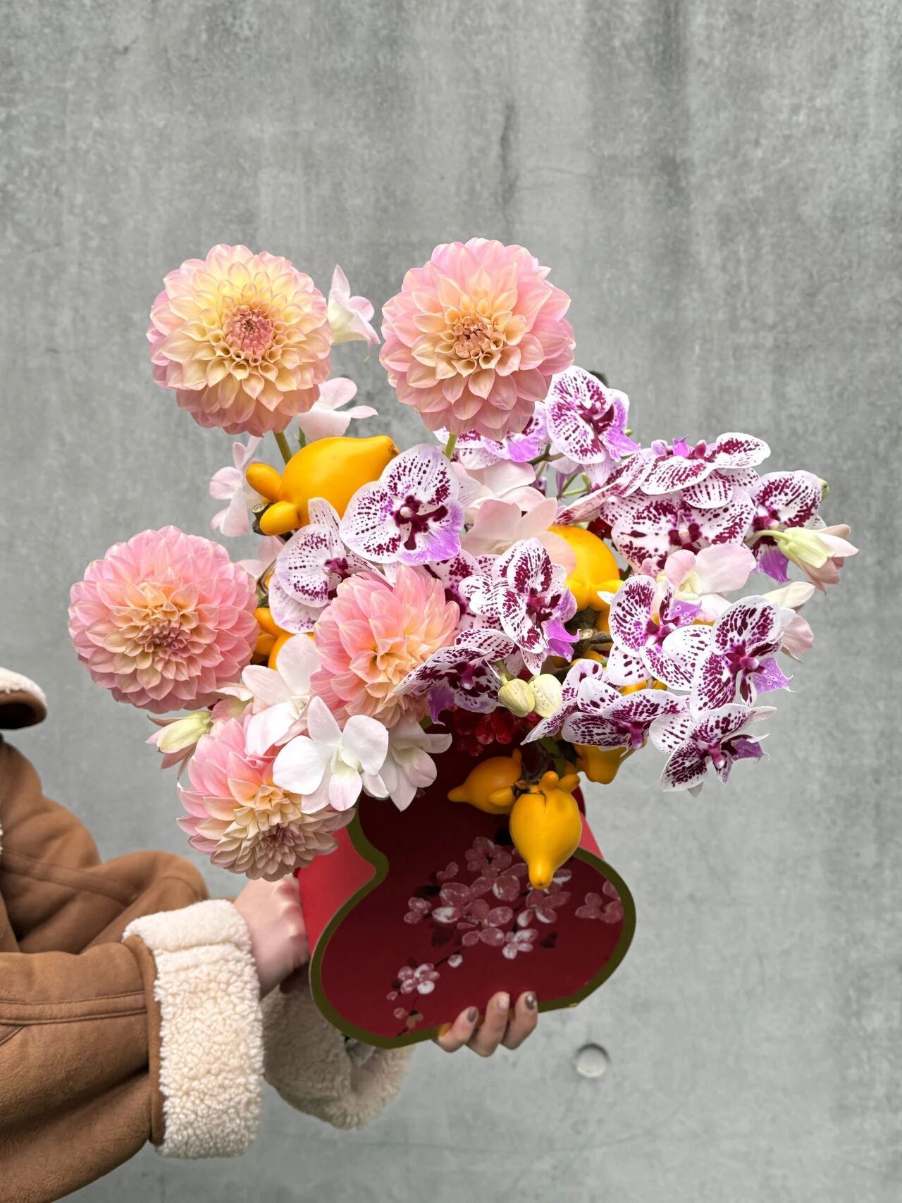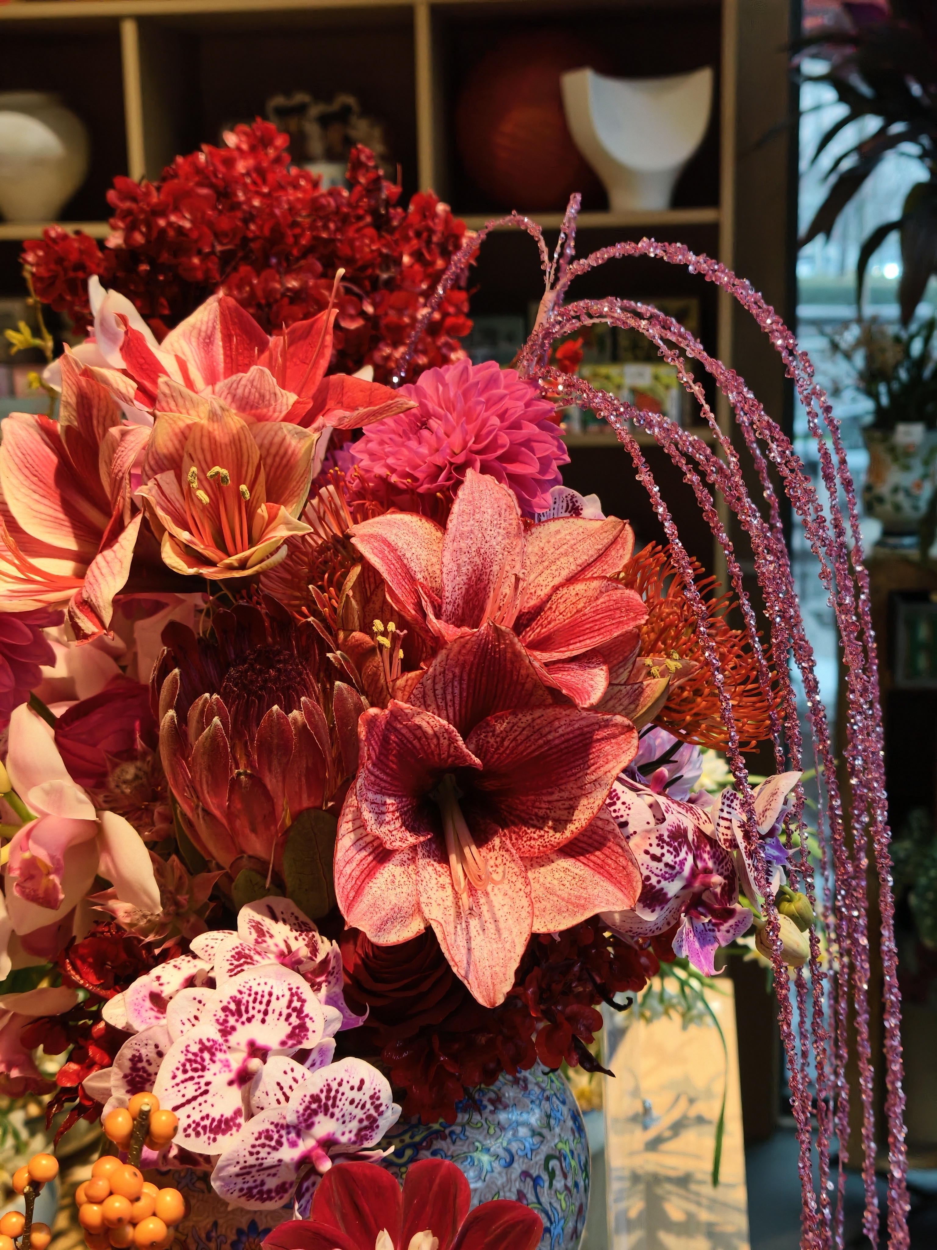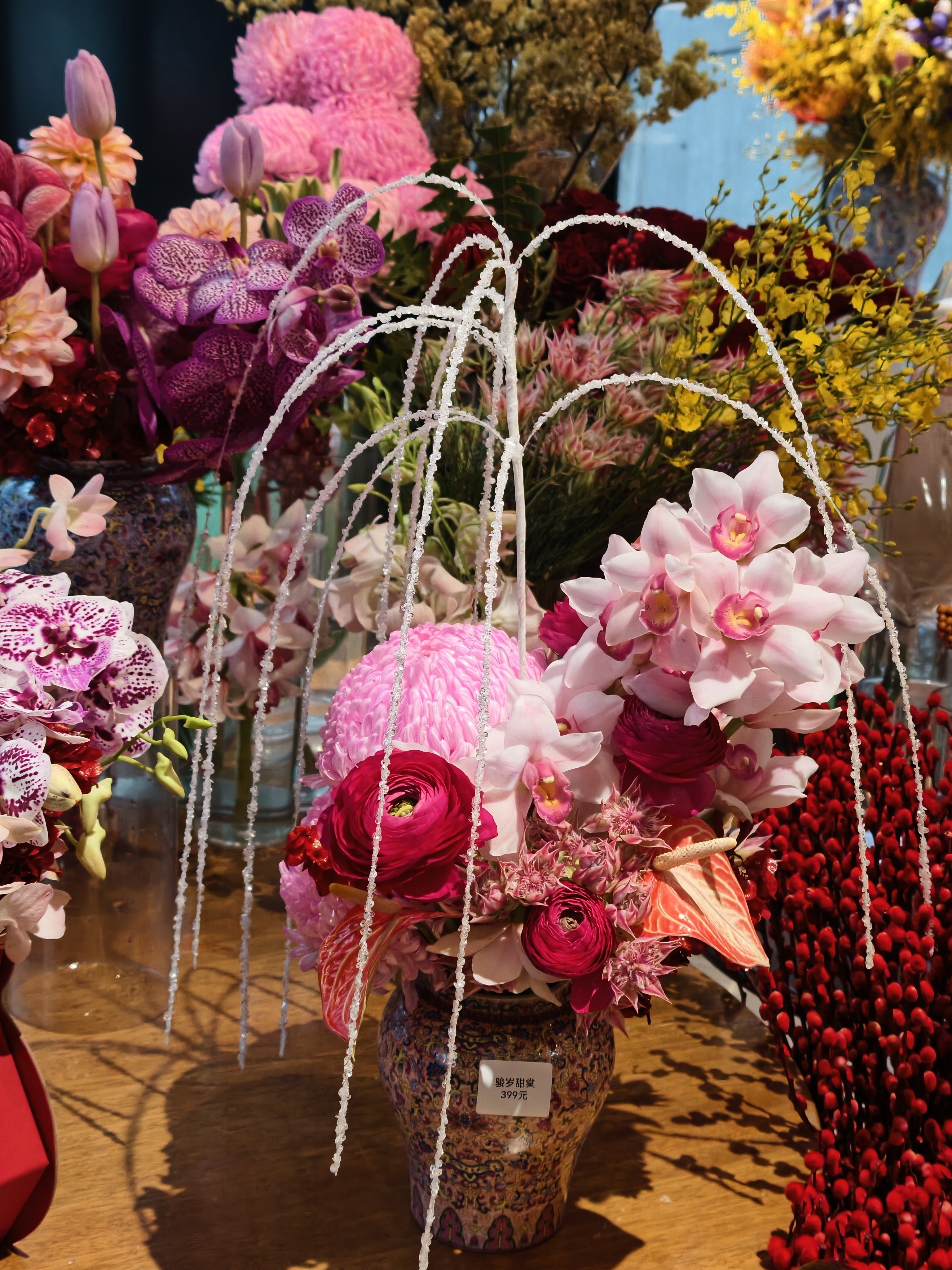 比如“春序甜玫”以大丽花、百合与帝王花构成浓郁油画色调,寓意新岁繁花似锦;