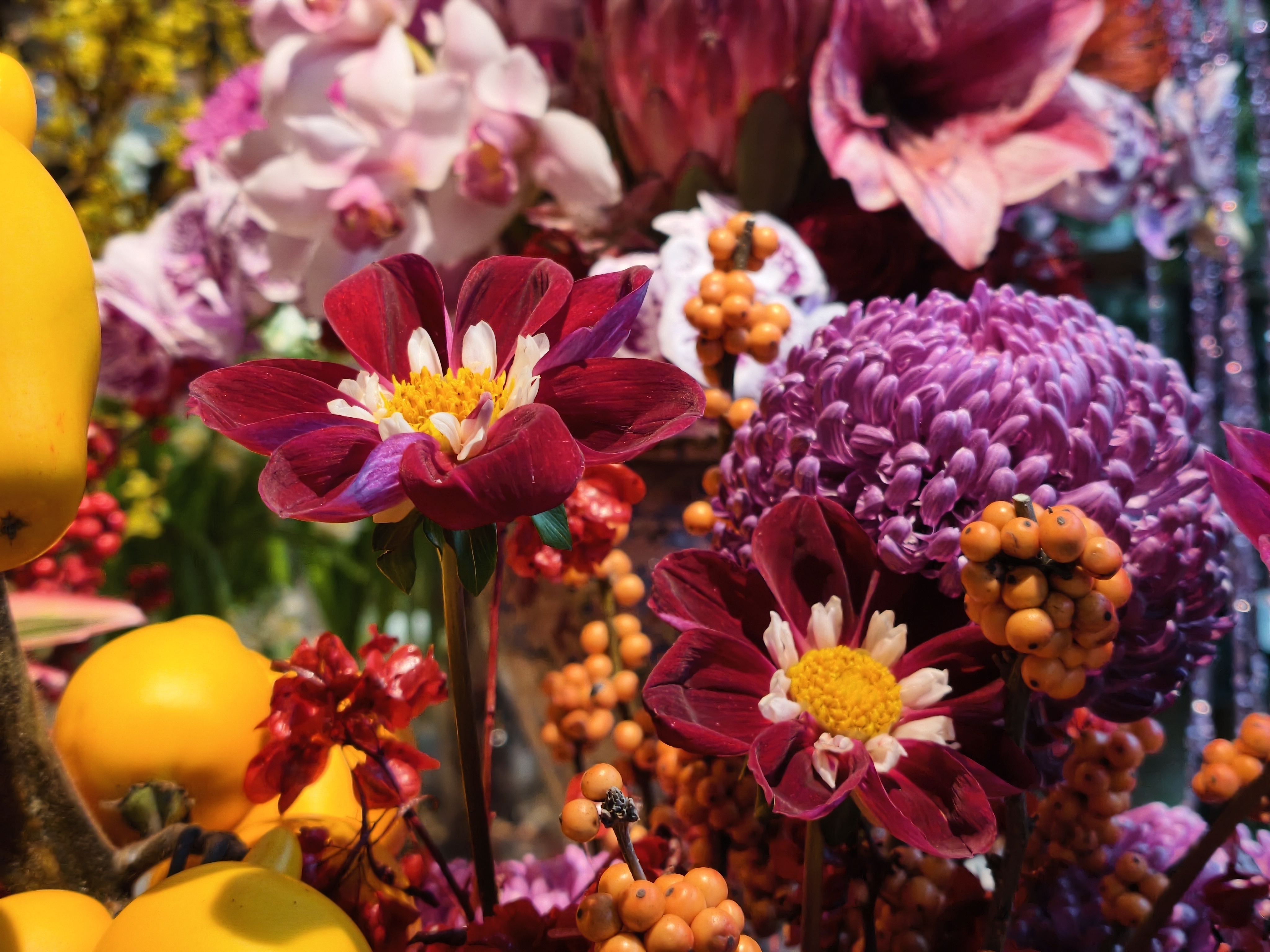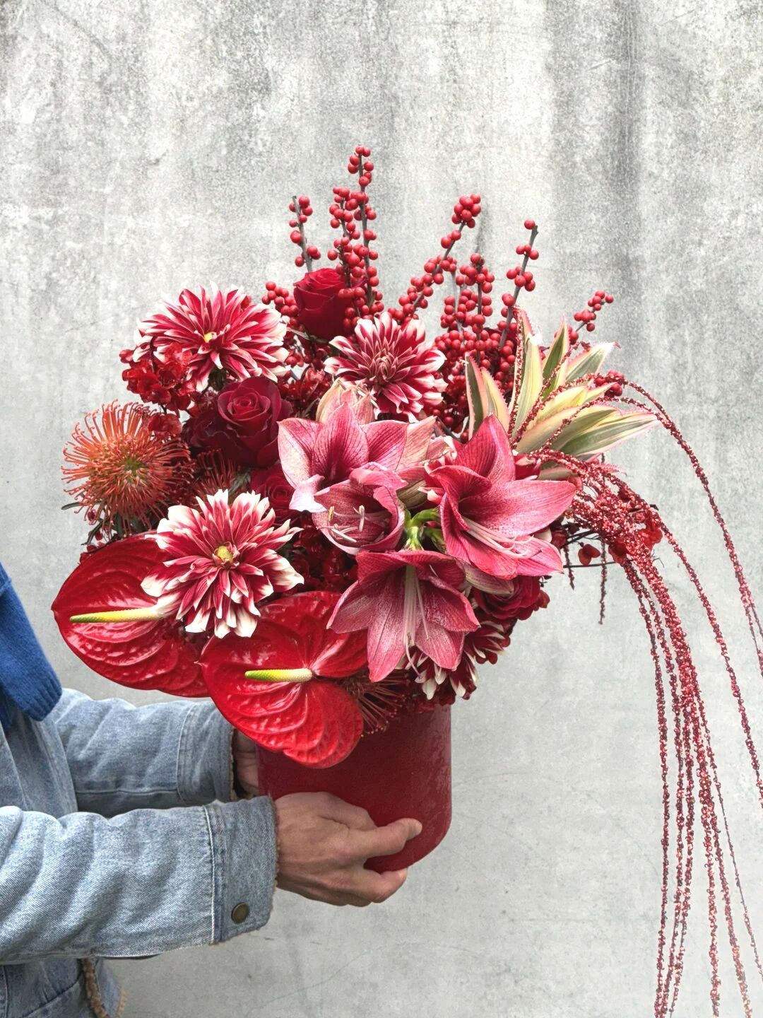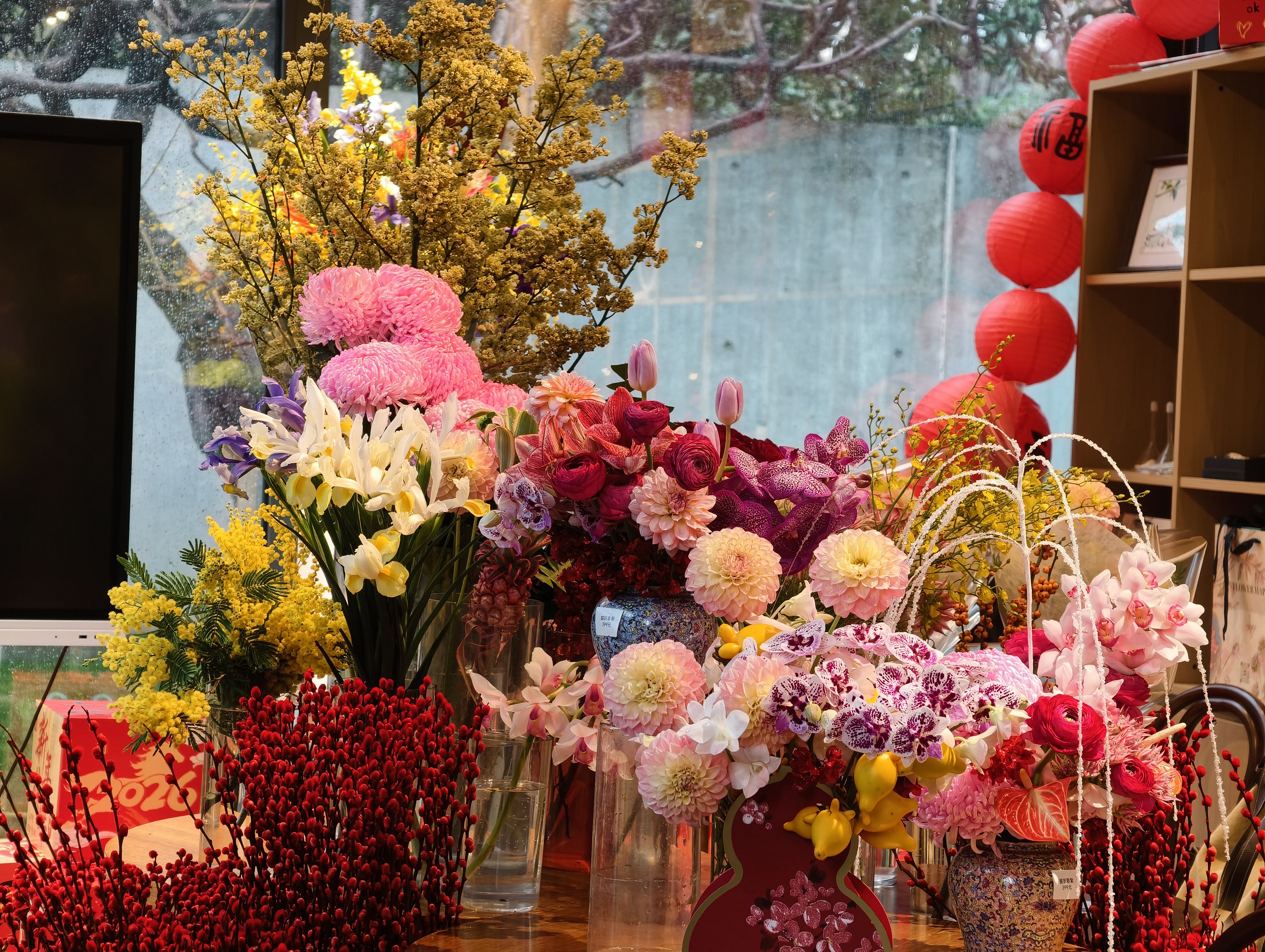 比如“春序甜玫”以大丽花、百合与帝王花构成浓郁油画色调,寓意新岁繁花似锦;