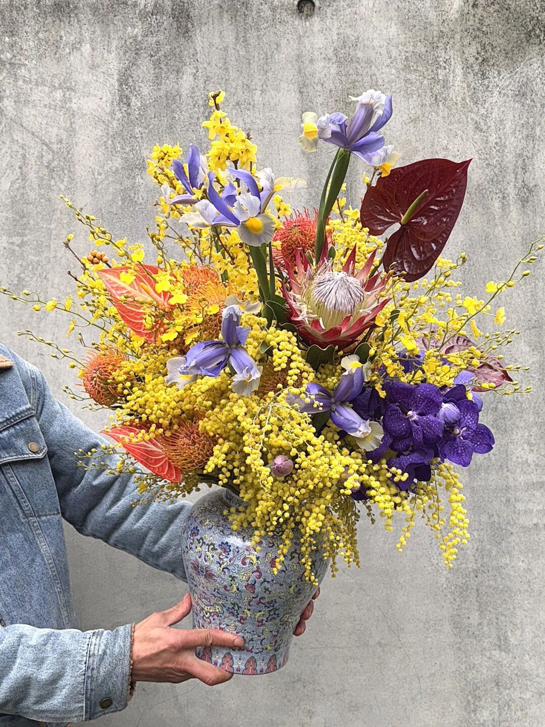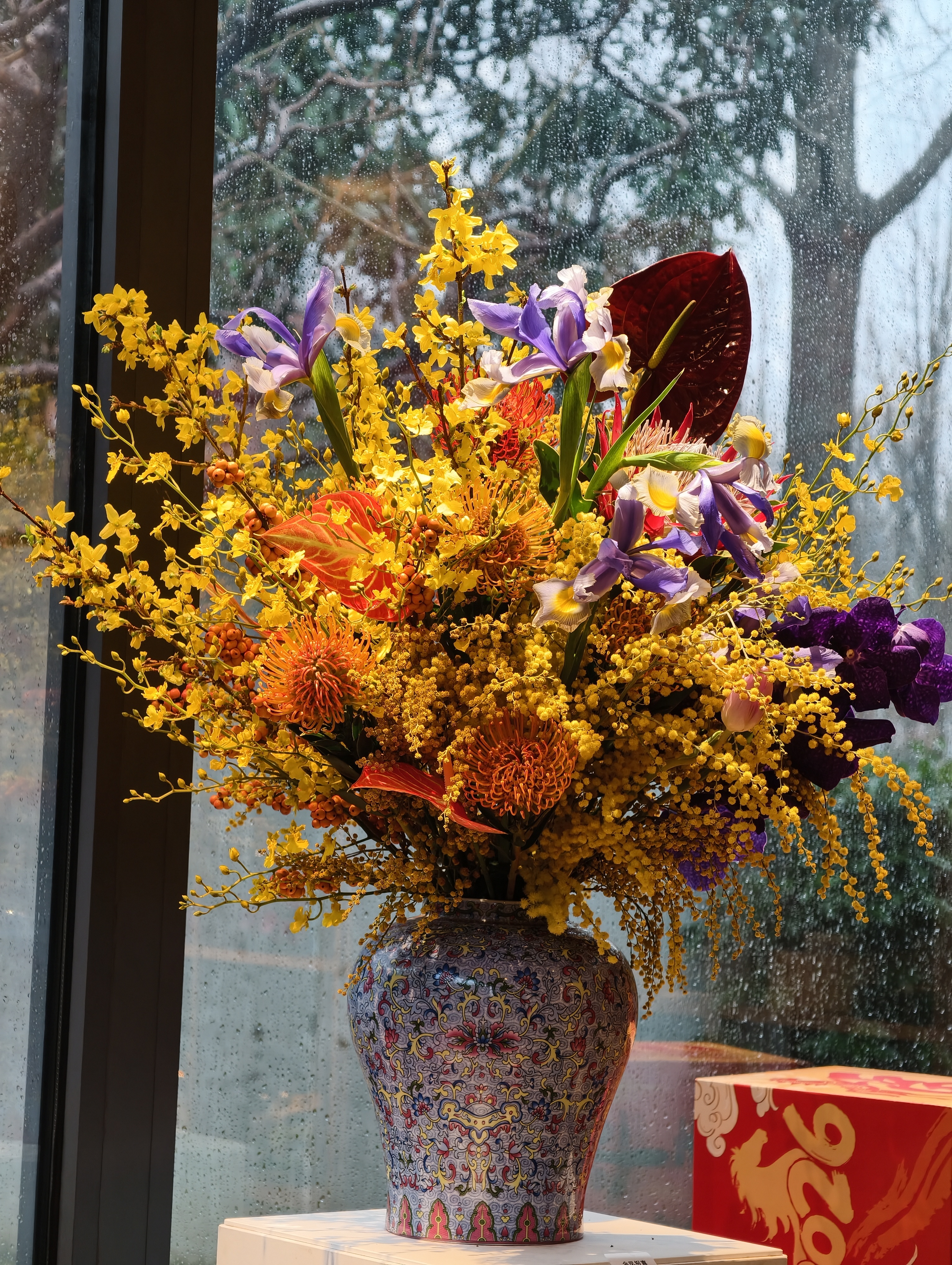 “金凤报喜”以明黄金合欢搭配深紫鸢尾与帝王花,金色与紫色交织,象征金玉满堂、紫气东来;
