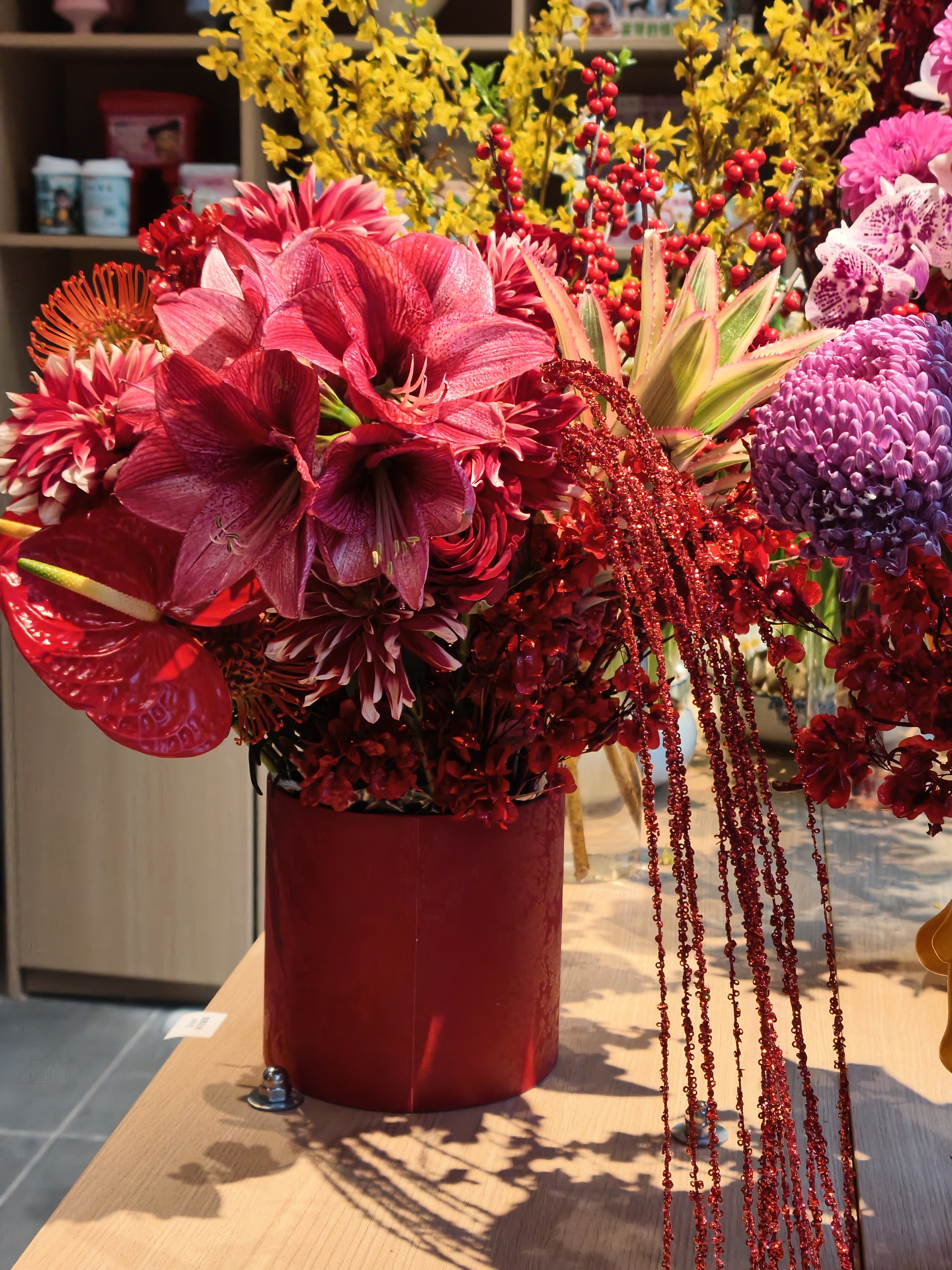 “鸿运满堂”则以红掌、百合为主角,祝福日子红红火火。